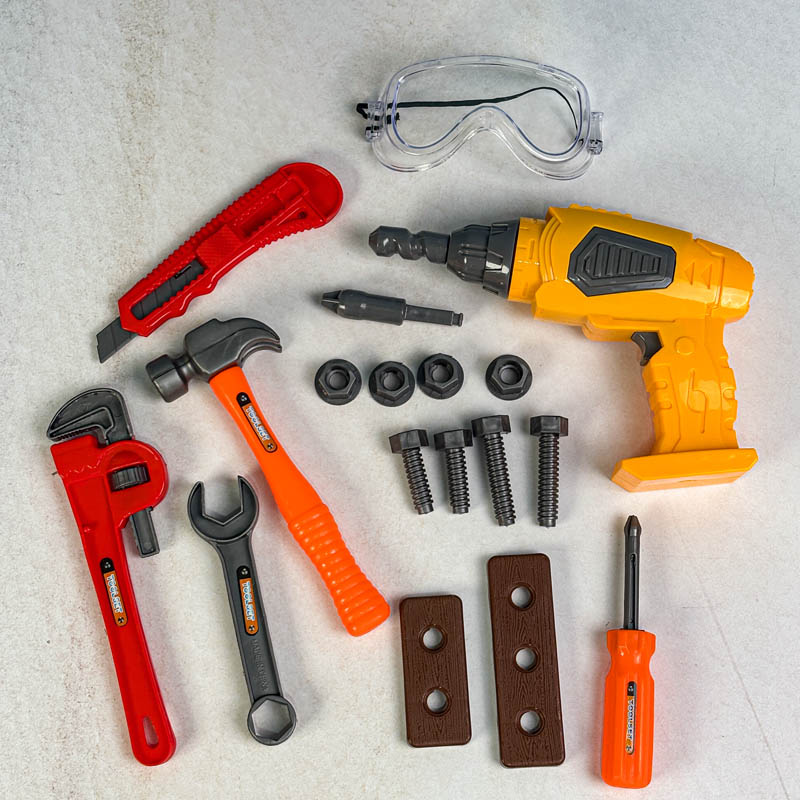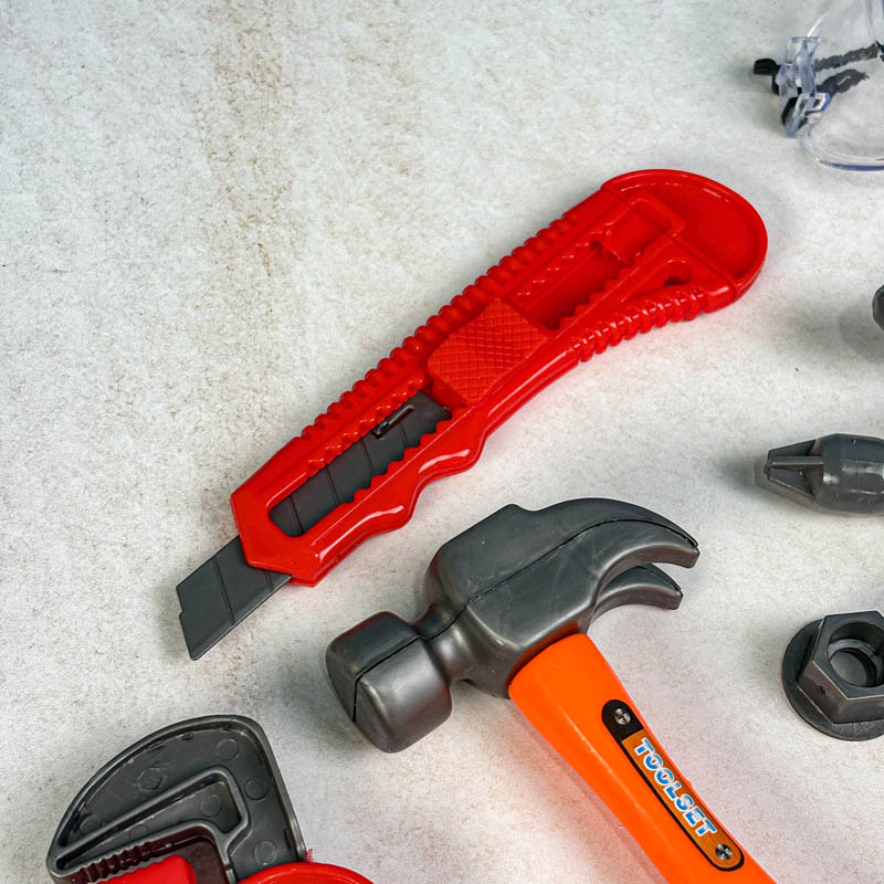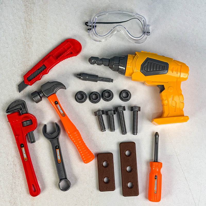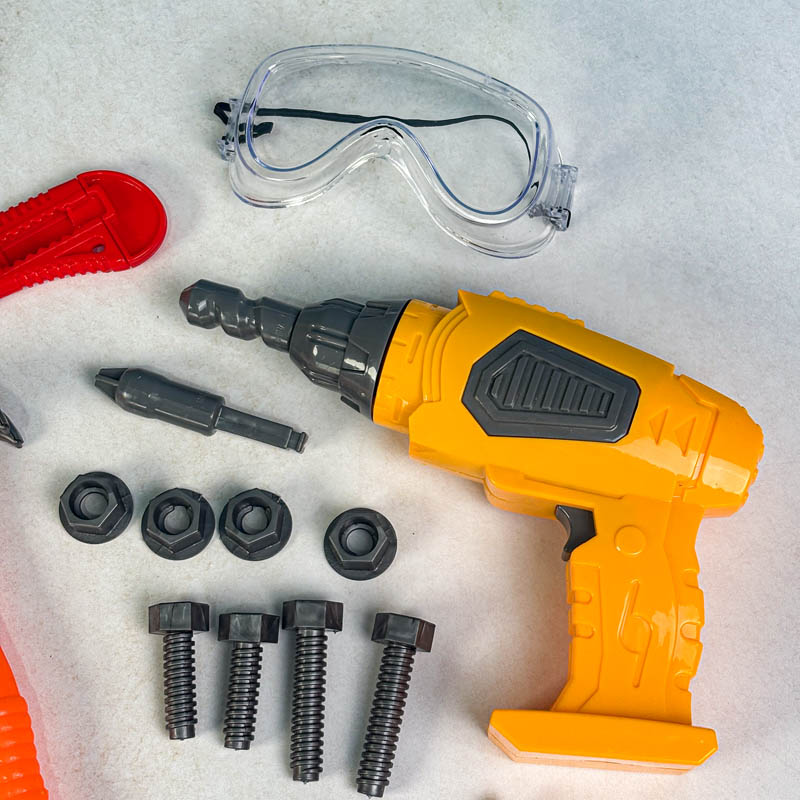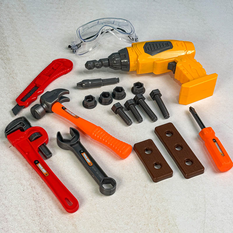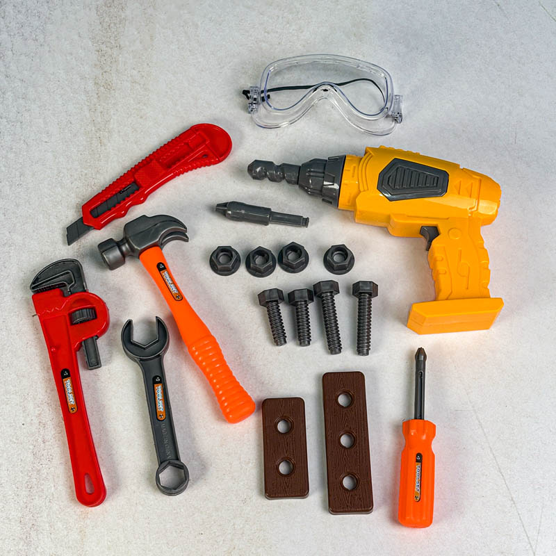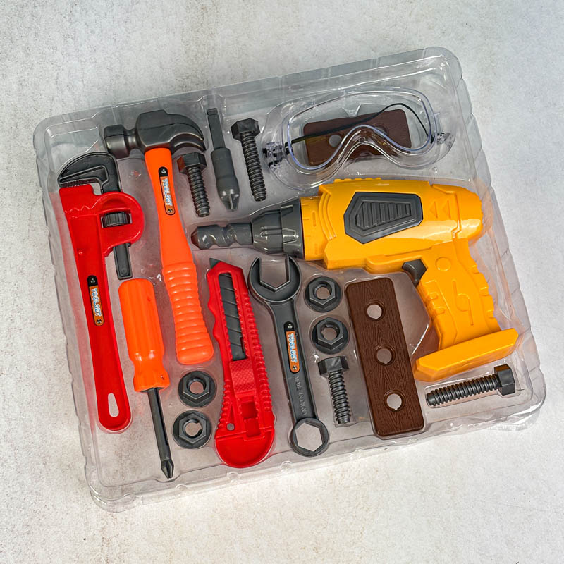 وقتشه که کودک شما با ست ابزارش یه مهندس کاربلد و همه کاره بشه. توی جعبه ی این اسباب بازی 18 تکه ست ابزار مثل چکش ، دریل، پیچ گوشتی ، انبردست، عینک کار و ... داره که کودک میتونه باهاش ساعت ها مشغول نقش آفرینی باشه. ست ابزار مناسب کودکان 3 سال به بالاست