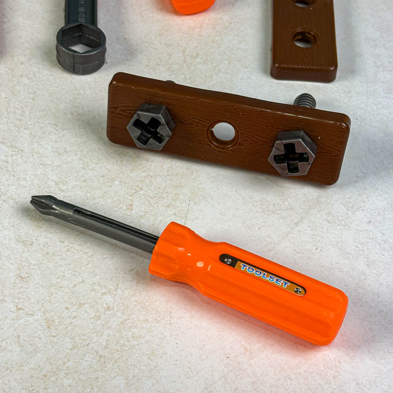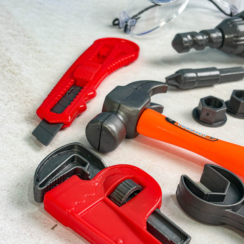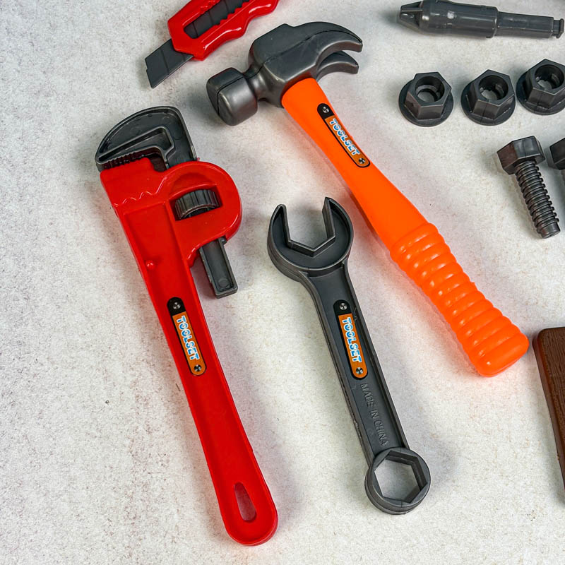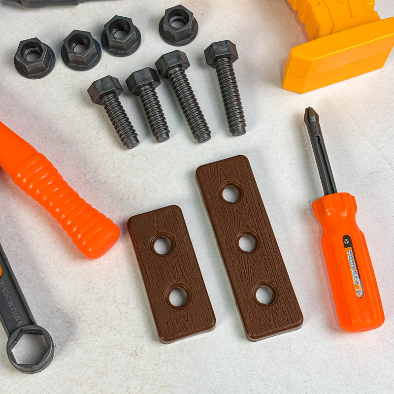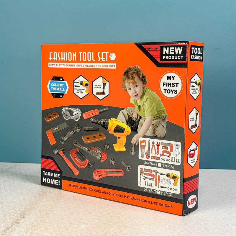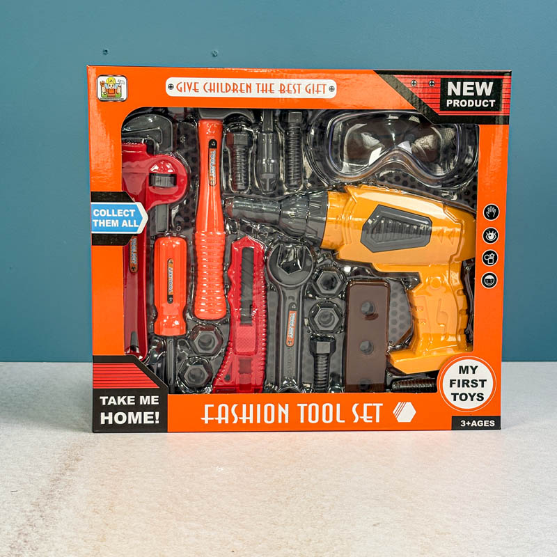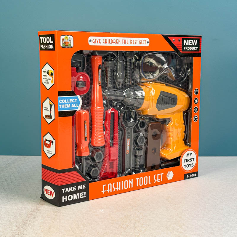 وقتشه که کودک شما با ست ابزارش یه مهندس کاربلد و همه کاره بشه. توی جعبه ی این اسباب بازی 18 تکه ست ابزار مثل چکش ، دریل، پیچ گوشتی ، انبردست، عینک کار و ... داره که کودک میتونه باهاش ساعت ها مشغول نقش آفرینی باشه. ست ابزار مناسب کودکان 3 سال به بالاست