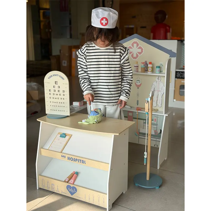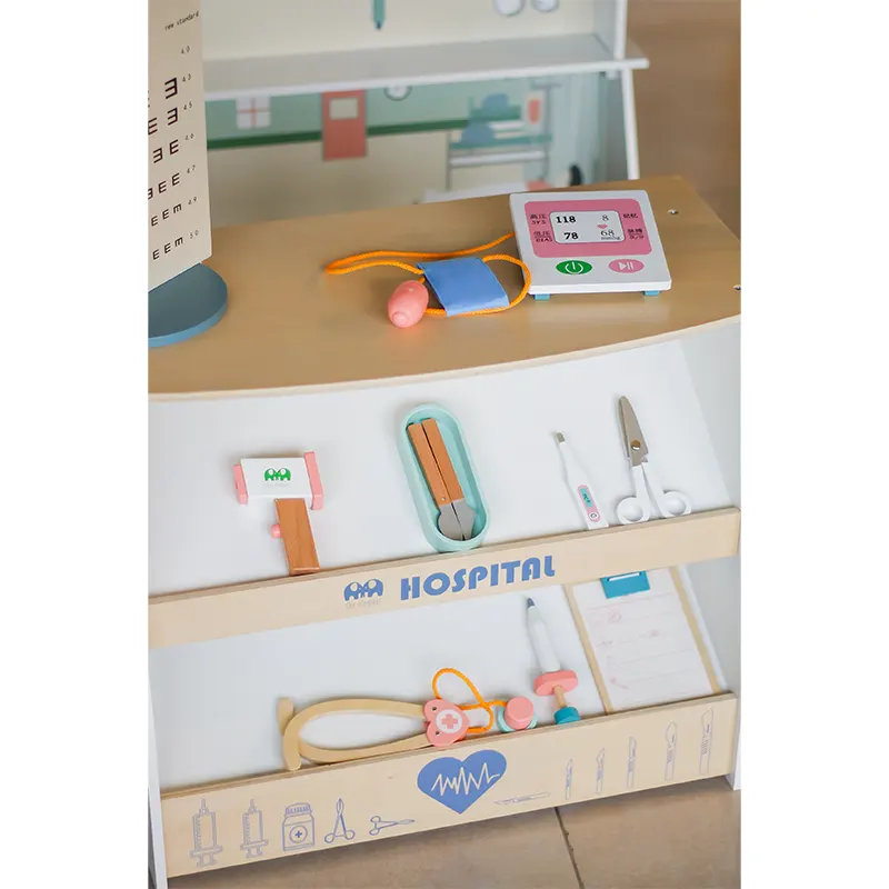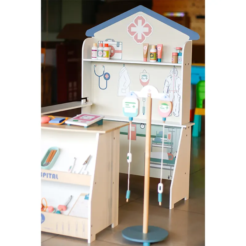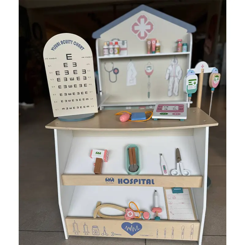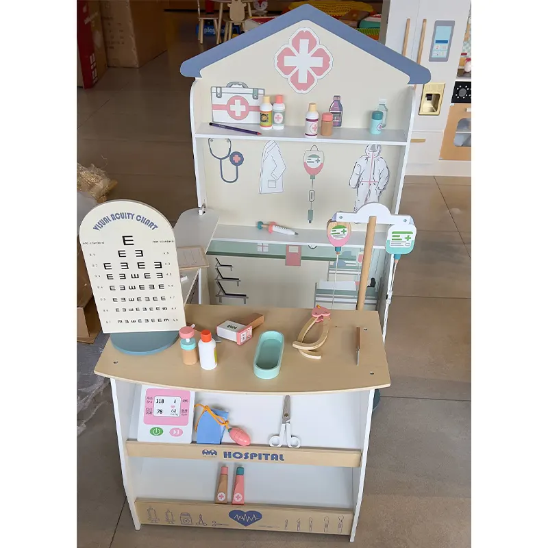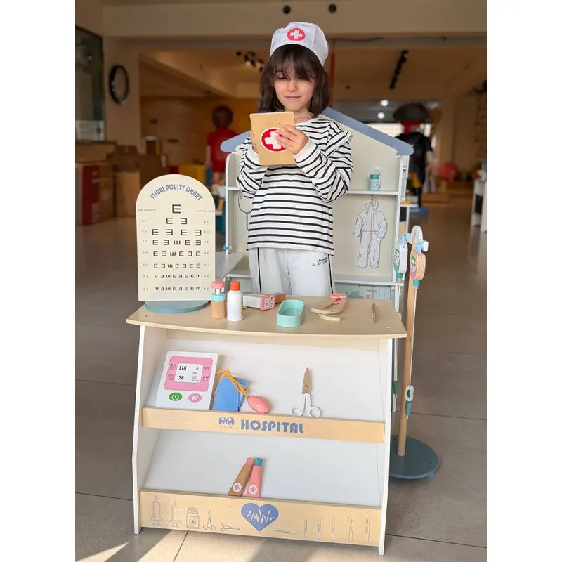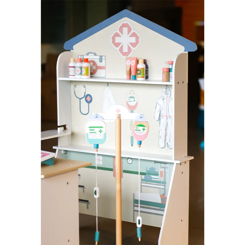 اسباب بازی چوبی بیمارستان یک اسباب بازی تجهیزات مهد کودک مشاغل است که از یک بیمارستان چوبی، استند دارو، استند سرم، بینایی سنجی، گوشی پزشکی، فشار سنج چوبی و... تشکیل شده و برای بچه های بالای 3 سال مناسب است. این اسباب بازی هیچ لبه تیز و برنده ای ندارد و در برابر ضربه مقاوم است و از چوب با کیفیت مطابق با استانداردهای اروپایی ساخته شده است.