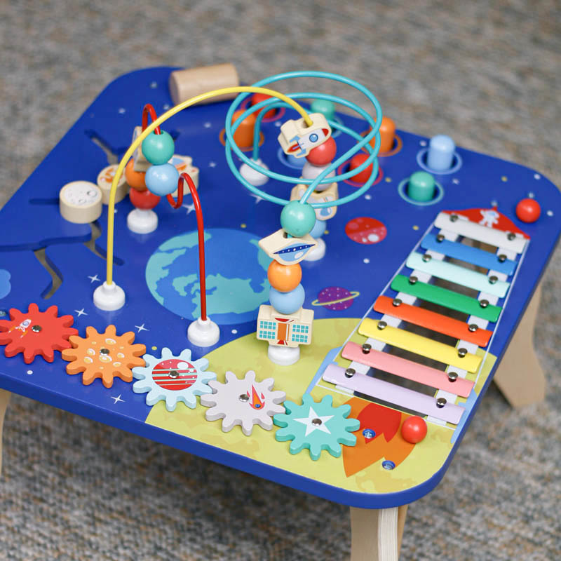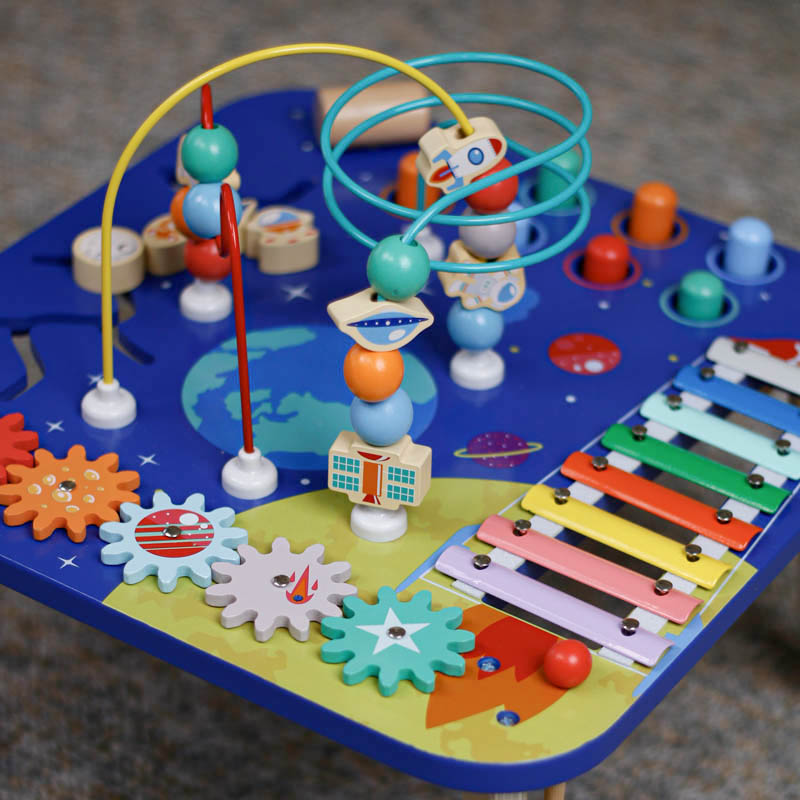 میز بازی کودک چوبی کهکشان کد BL20217 با 5 فعالیت در یک میز شامل میله و مهره ، چرخ دنده ، بلز ، ماز و چکش و میخ است .این میز بازی کودک دارای رنگ های متنوع و جذاب است که باعث شناخت رنگ کودک میشود کمک میکند تا کودک بازی کند ، سرگرم شود و همچنین حرکاتش را بهتر هماهنگ کند. این اسباب بازی برای سن بالای 36 ماه مناسب است و متناسب با کودک طراحی شده است تا بتواند به هر قسمت از آن که می خواهد برسد. این اسباب بازی با رنگ های شادی که در آن به کار رفته می تواند در جلب توجه کودک به صدا و رنگ مفید بوده و به بهبود کارایی دیداری و شنیداری کودک کمک کند. این میز آموزشی باعث تحریک خلاقیت و هوش خواهد شد.