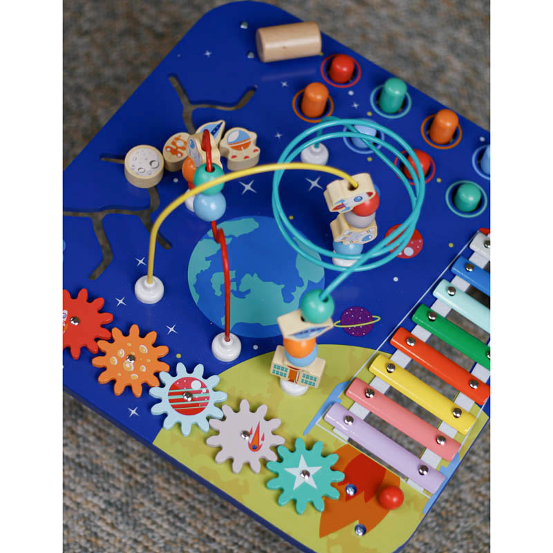 5 فعالیت در یک میز ، میز بازی چوبی کهکشان کد BL20217 شامل میله و مهره ، چرخ دنده ، بلز ، ماز و چکش و میخ است . این بازی هم یک میز است هم یک اسباب بازی مفرح و هم یک ابزار مونته سوری که برای بچه های بالای سه سال یک اسباب بازی مناسب و کاربردی است . این میز بازی یکی از بهترین هدایای تولد سه و چهار سالگی است . فرقی نمیکند که این میز را بخواهید برای یک دختر بچه خریداری کنید یا برای یک پسر هردو عاشق این میز میشوند . این میز بازی مفرح و موزیکال مخصوص کودک با رنگ های شادی که در آن به کار رفته می تواند در جلب توجه کودک به اشکال و رنگ ها مفید بوده و به بهبود مهارت های حرکتی ، دیداری، هماهنگی چشم و دست ، استدلال و... کودک کمک کند و ساعت ها سرگرمی برای کودک به همراه آورد . این اسباب بازی برای کودکان بالاتر از 36 ماه مناسب است . همچنین با داشتن بلز برای تربیت شنوایی و آموزش اشکال به کودک مناسب می باشد .
