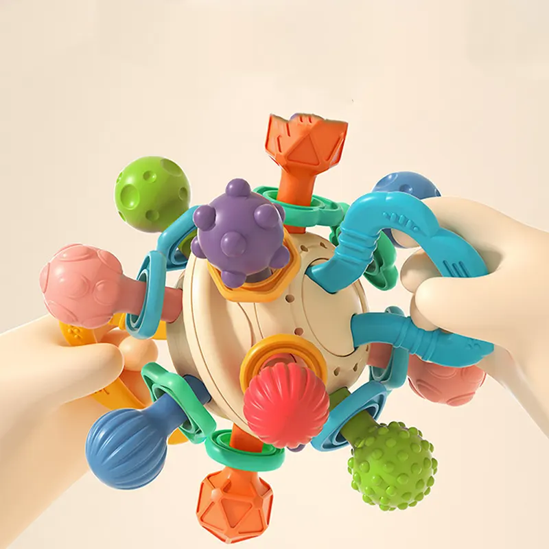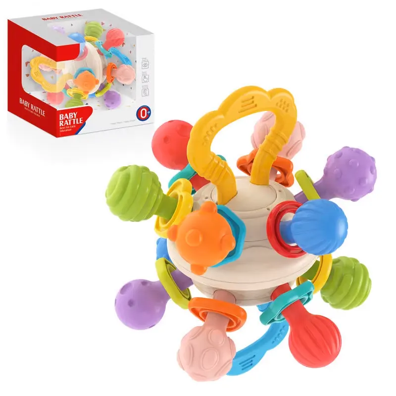 این جغجغه توپی برای توپ بازی نوزادان بالای 6 ماه نیز مناسب است و چون جنس آن از سیلیکون است حتی اگر پرت شود و به کودک اصابت کنید نیز خطرناک نیست . بر روی هریک از اشکال نصب شده بر روی این توپ یک حلقه پلاستیکی قرار داده شده است که با تکان دادن جغجغه این حلقه ها باعث ایجاد صدا میشود .