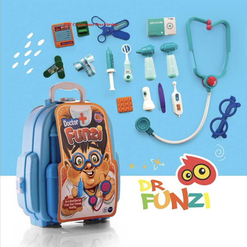 این اسباب بازی پزشکی شامل 22 تکه مانند عینک، گوشی پزشکی، تب سنج، چراغ قوه ، سرنگ ، چند عدد برچسب و... می باشد. دو عدد بند برای استفاده از این اسباب بازی به صورت کوله پشتی نیز در این بسته بندی وجود دارد .