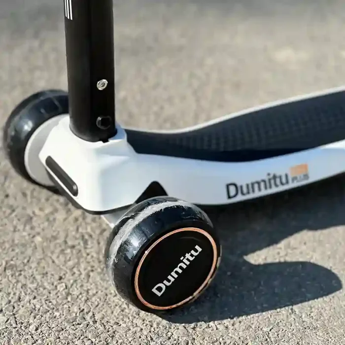اسکوتر کودک موزیکال چراغدار برند DUMITU یک اسکوتر کودک، چراغدار و موزیکال است که همراه با کودک شما رشد خواهد کرد. برای کودکان کوچکتر می توان از آن به عنوان اسکوتر با نشیمن با حداکثر ظرفیت وزنی 30 کیلوگرم استفاده کرد. دسته این اسکوتر قابلیت تنظیم ارتفاع در 4 حالت اسکوتر دارد و تا 80 کیلوگرم تحمل وزن دارد. این اسکوتر دارای 3 چرخ است و برای حرکت چرخ های جلو، کافیست دسته ی اسکوتر را همان طور که قرار دارد، به سمت چپ و راست فشار دهید و دیگر نیاز نیست دسته اسکوتر را حول محور نیم دایره ای بچرخانید. اسکوتر بچه گانه DUMITU بر روی چرخ عقب خود یک ترمز نیز دارد و با روشن کردن دکمه زیرش هم موزیک و هم نور پخش میکند و همچنین قابلیت اتال به بلوتوث دارد که جذابیت این اسکوتر را دو برابر میکند. این اسکوتر دارای قابلیت های منحصر به فردی از جمله بلوتوث ، دارای نشیمن، موزیکال و چرخ های چراغ دار میباشد. این مدل دارای تایرهای بزرگ و پایدار به همراه LED، ترمز چرخ عقب، پایه ضد لغزش و دستگیره های لاستیکی نرم است.