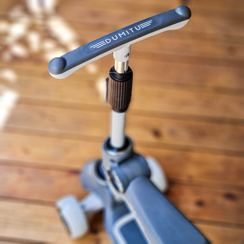 اسکوتر کودک موزیکال چراغدار برند DUMITU یک اسکوتر تاشو، چراغدار و موزیکال است که همراه با کودک شما رشد خواهد کرد. برای کودکان کوچکتر می توان از آن به عنوان اسکوتر با نشیمن با حداکثر ظرفیت وزنی 25 کیلوگرم استفاده کرد. دسته این اسکوتر قابلیت تنظیم ارتفاع در حالت اسکوتر دارد و تا 70 کیلوگرم تحمل وزن دارد. این اسکوتر دارای 3 چرخ است و برای حرکت چرخ های جلو، کافیست دسته ی اسکوتر را همان طور که قرار دارد، به سمت چپ و راست فشار دهید و دیگر نیاز نیست دسته اسکوتر را حول محور نیم دایره ای بچرخانید. اسکوتر بچه گانه DUMITU بر روی چرخ عقب خود یک ترمز نیز دارد و با روشن کردن دکمه زیرش هم موزیک و هم نور پخش میکند که جذابیت این اسکوتر را دو برابر میکند. این اسکوتر دارای قابلیت های منحصر به فردی از جمله تاشو بودن ، دارای نشیمن، موزیکال و چرخ های چراغ دار میباشد. این مدل دارای تایرهای بزرگ و پایدار به همراه LED، ترمز چرخ عقب، پایه ضد لغزش و دستگیره های لاستیکی نرم است.