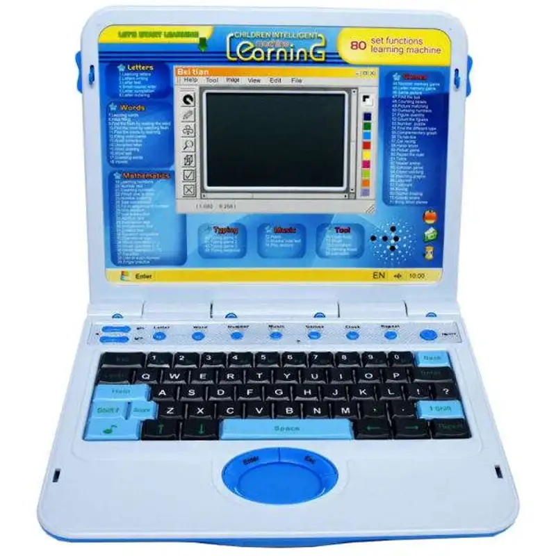 لپ تاپ آموزشی هشتاد کاره! یک وسیله ی کمک آموزشی مناسب برای کودکان می باشد. در این لپ تاپ 80 برنامه ی کاربردی هدفمند طراحی شده است که کودک ضمن یادگیری و بازی با برنامه ها با کلید ها و فضای یک لپ تاپ واقعی نیز آشنا می شود. با استفاده از این لپ تاپ آموزشی کودکان با اعداد انگلیسی، حروف الفبای انگلیسی، کلمات انگلیسی، اعداد و عملیات ریاضی، مفهوم شمارش، اعداد زوج و فرد، بزرگتر، کوچکتر و مساوی، تایپ کردن جمله، نت موسیقی، ماشین حساب و ساعت آشنا می شوند. این لپ تاپ دارای گزینه بازی نیز می باشد که شامل بازی های مختلف مثل ماشین بازی برای کوچولو ها می باشد. موس از طریق سیم به لپ تاپ متصل شده و روی آن دو کلیدEnter و Esc قرار دارد که می توان از آنها استفاده کرد. برای باز کردن لپ تاپ دو کلید کناری را به جلو بکشید تا لپ تاپ باز شود و نیاز به 3 باتری 1.5v دارد.