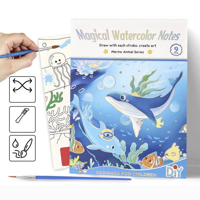 یک اسباب بازی جدید و سرگرم کننده، دفتر رنگ آمیزی آبرنگی یک دفتر رنگ آمیزی دخترانه و پسرانه برای گروه سنی بالای 3 سال است. این دفتر رنگ آمیزی شامل یک دفتر 9 برگی و یک قلم مو است. شما حتی با ترکیب رنگ های آبرنگ می توانید رنگ های جدیدی را درست کنید.