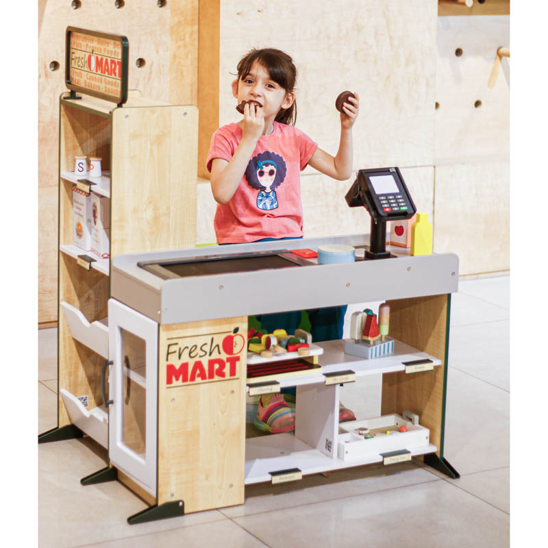 بازی خرید و فروش هرگز به اندازه فروشگاه مواد غذایی چوبی Fresh Mart از برند Melissa & Doug سرگرمکننده نخواهد بود! این استند فروشگاهی دارای گوشهها و لبههای نرم و گرد به مشتریان 3 سال به بالا اجازه میدهد که به قفسههای مختلف این فروشگاه رفته و خریدهای خود را از یک سمت پرداخت کنند و به فروشنده این امکان را میدهد در پشت صندوق قرار گرفته و خرید های مشتریان را ثبت و حساب کنند و یک بازی گروهی جذاب و هیجان انگیز بسازد. ویژگیهای واقعی شامل «اسکنر» صدا دار، تسمه نقاله دستی، دستگاه کارتخوان، ماشین حساب با کلید و کشوی پول است. قفسههای فراوان در هر دو طرف برای نمایش و قرار دادن مواد غذایی وجود دارد (این اسباب بازی بدون اکسسوری است). کودکان همه چیزهایی را که در لیست خریدشان دارند، در این فروشگاه خانواده پیدا خواهند کرد.