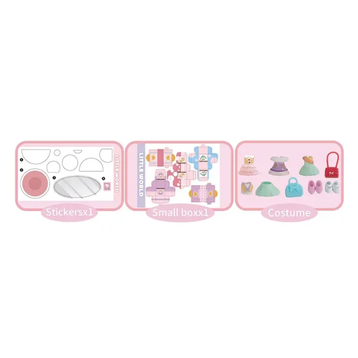 | اقلام همراه | لوازم برای ساخت خانه، 1 عدد عروسک، آینه، استند لباس، جالباسی، 4 عدد پیراهن، 2 عدد کیف، 2 عدد کفش |