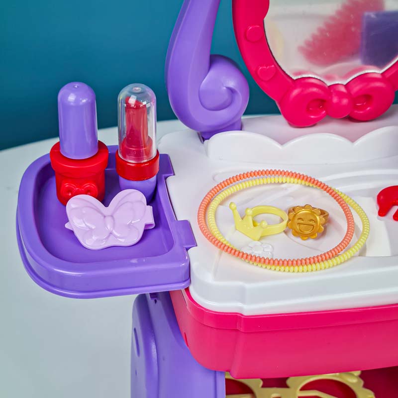 لوازم آرایشی کودک برای کوچولوهای بالای 3 سال! دختر کوچولو ها ساعت ها با این لوازم آرایشی کیفی 2 در 1 می تونن سرگرم بشن و بازی کنن. کودکان می توانند از این اسباب بازی دخترانه در دو حالت به عنوان کیف و میز توالت برای قراردادن اسباب بازی های آرایشی استفاده کنند. این لوازم آرایشی بچه گانه دارای 24 اکسسوری مختلف شامل عینک، گردنبند، رژلب، برس، سشوار، عطر، گیره سر، پالت سایه، بند کیف و... می باشد. لوازم آرایشی بچه گانه این اسباب بازی حالت فیگور و غیر واقعی می باشد.