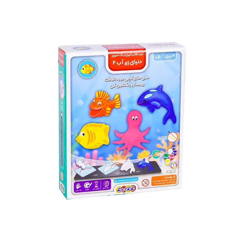 کیت قالب گیری و رنگ آمیزی دنیای زیر آب 2 برای کودکان بالای 5 سال ایده آل است. با این اسباب بازی ساختنی میتوان حیوانات دریایی ساخت و آن را به در یخچال و... چسباند. این ست شامل رنگ 6 عددی، قلم مو، 2 بسته پودر گچ، مگنت، کاردک و کاغذ راهنما است.
