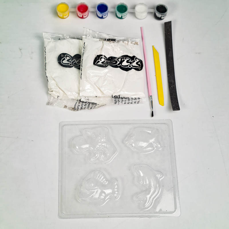 - اقلام همراه: رنگ 6 عددی، قلم مو، 2 بسته پودر گچ، مگنت، کاردک و کاغذ راهنما