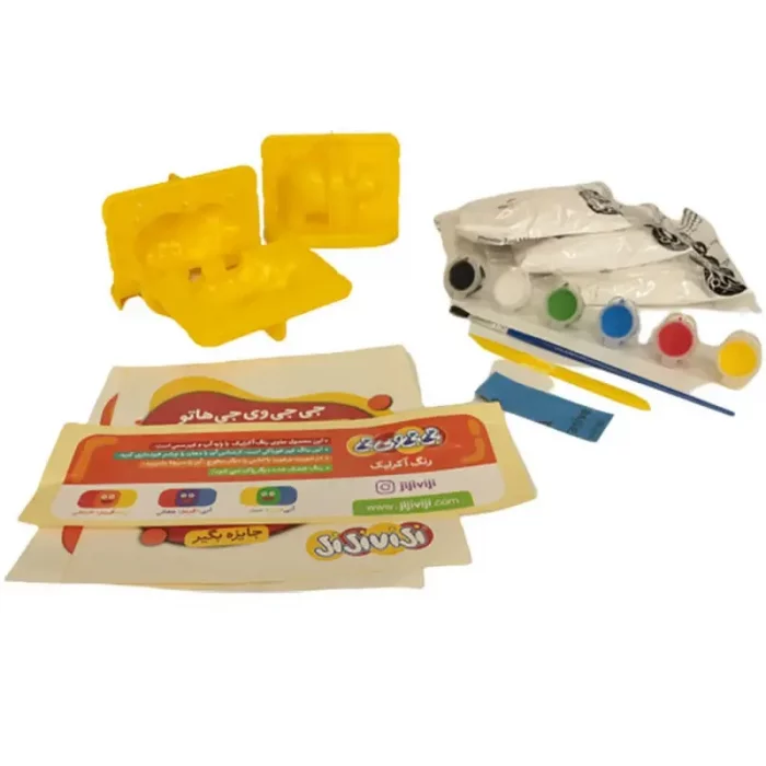 - اقلام همراه: رنگ 6 عددی، قلم مو، 2 بسته پودر گچ، سمباده، قالب سه بعدی کاردک و کاغذ راهنما