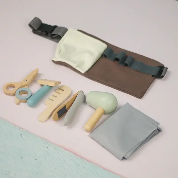 - دارای ابزارهای قیچی، ریش تراش، سشوار، اتو مو، شانه، پیشبند و یک کمربند پارچه ای که وسایل در آن قرار می گیرند