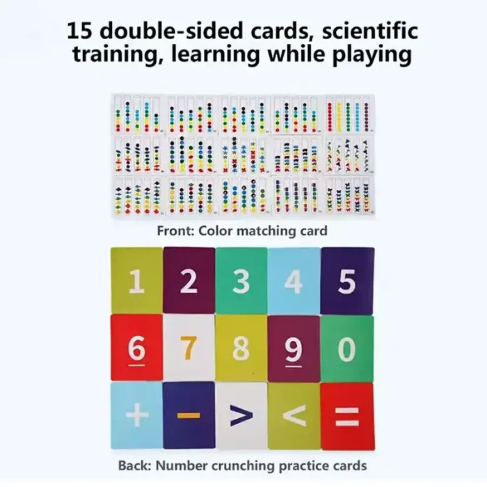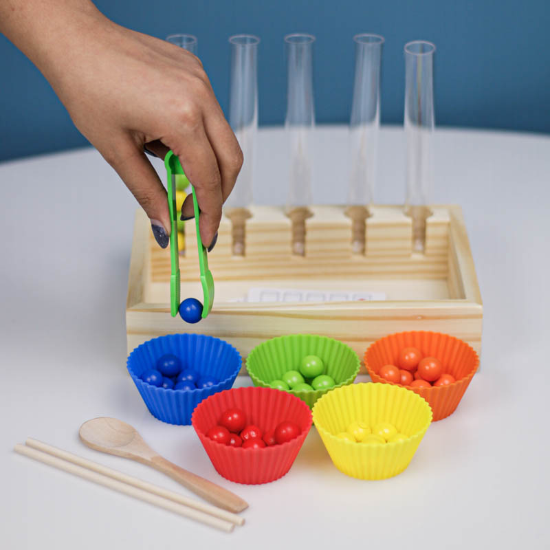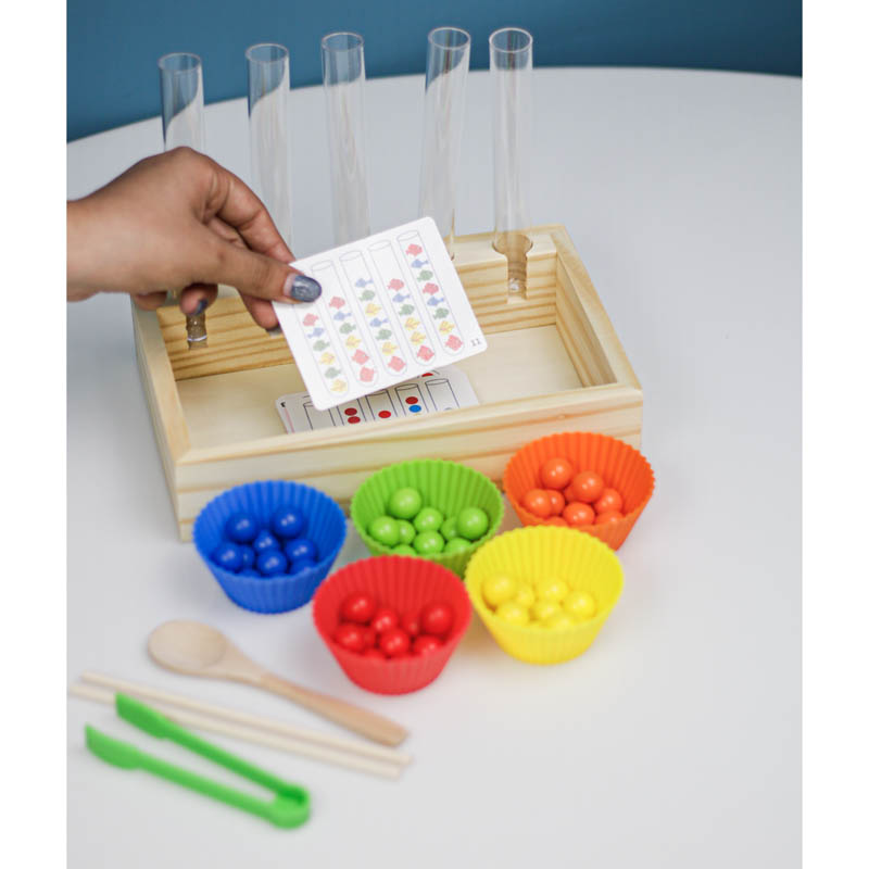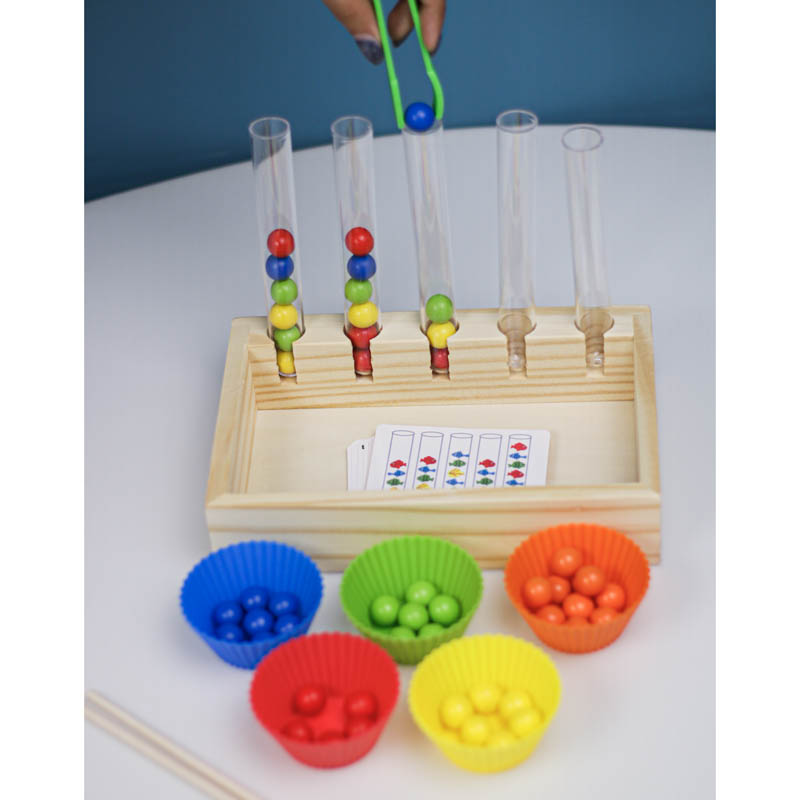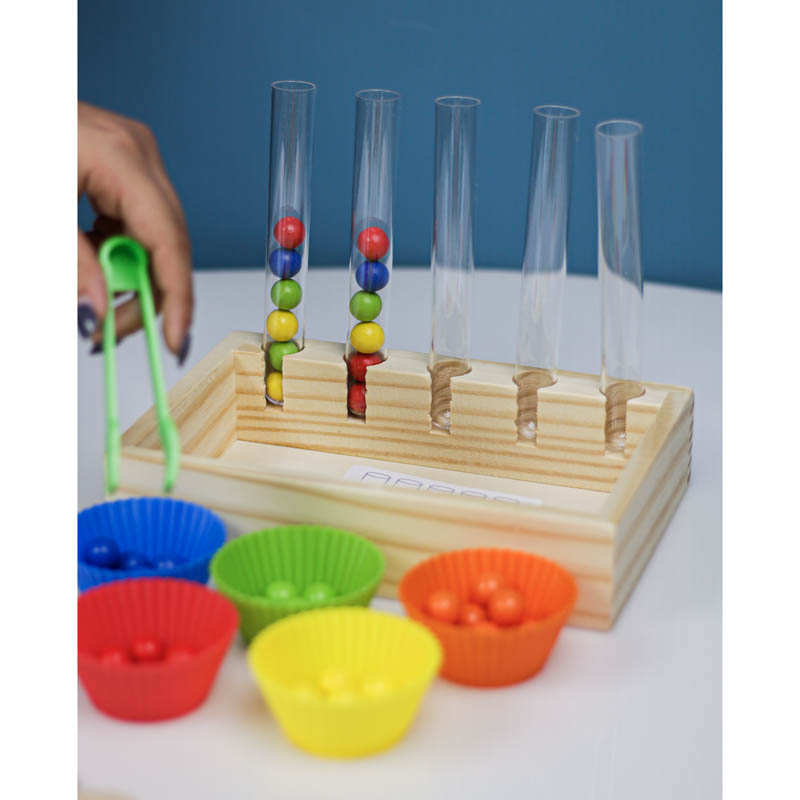 | اقلام همراه | توپهای رنگی در 5 رنگ مختلف، 4 عدد لوله شفاف برای چیدن توپها، پایه چوبی مخصوص قرارگیری لولهها، انبرک، قاشق و چاپستیک برای انتقال توپها، 5 کاسه رنگی پلاستیکی، 15 کارت الگو برای چالشهای ذهنی |