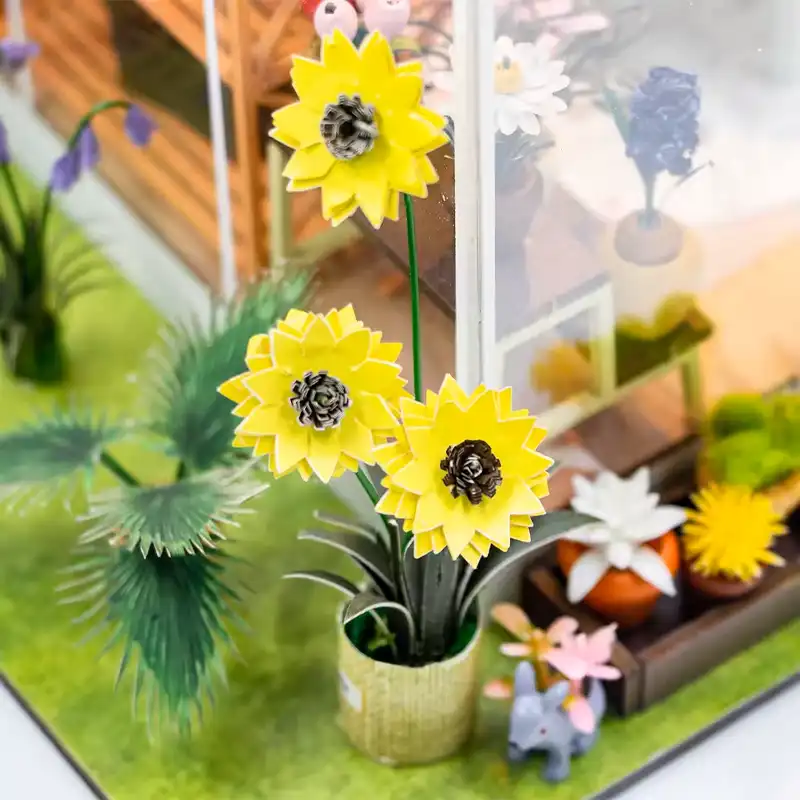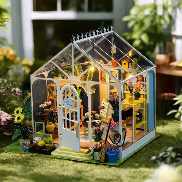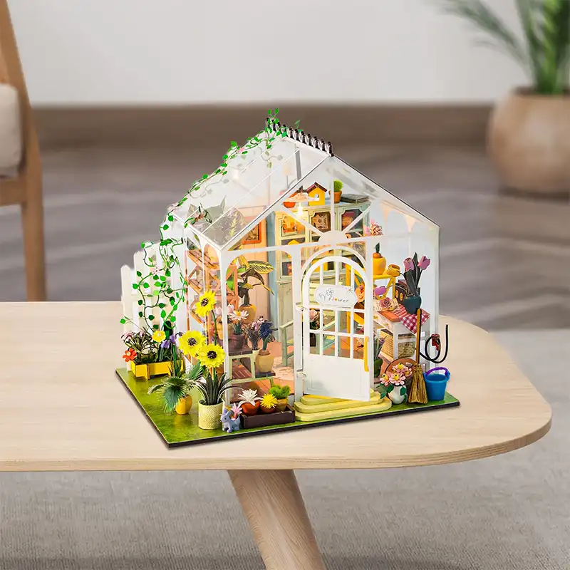 این اسباب بازی چوبی دارای 4 چهارچوب شیشه ای و تلقی برای ساخت گلخانه و قطعات مختلف برای ساخت گل و گیاه و استند درون آن می باشد.به دلیل داشتن قطعات ریز این ست خانه سازی و اتصالات الکتریکی برای بچه های بالای 14 سال پیشنهاد شده اما کودکان کوچکتر با نظارت والدین می توانند این گلخانه مینیاتوری را بسازند ( البته دور از دسترس کودکان زیر 3 سال قرار گیرد. ). همچنین این اسباب بازی دارای جای باتری و لوازمی برای روشن کردن چراغ های ال ای دی می باشد. به علاوه قطعات این ست ساخت و ساز به کمک چسب چوب و کاغذ همراه محصول به هم متصل می شوند. این مجموعه یک راه بسیار خوب برای تشویق کودکان به خلاقیت است و به کودک این امکان را می دهد تا خود را در نقش یک معمار و طراح ببینند.