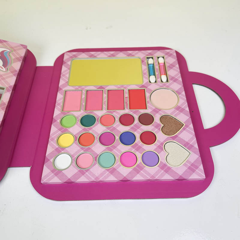 پک لوازم آرایشی بچه گانه دارای 1 عدد آینه در پالت، سایه، رژ گونه، کانتور، لاک، سوهان، ست براش، 2 عدد اپلیکاتور سایه و پد انگشت و... می باشد که بر پایه آب و غیر سمی است و برای سلامتی کوچولوها هیچ خطری ندارد و به راحتی تمیز میشود. این اسباب بازی مناسب پوست حساس بچه هاست و هیچ خطری برای آنها ندارد و به راحتی با آب از روی پوست پاک میشود. این پک لوازم آرایشی بچگانه که از جنس پلاستیک است به شکل یک کیف تاشو جذاب و زیبا طراحی شده است که به راحتی باز و بسته میشود.