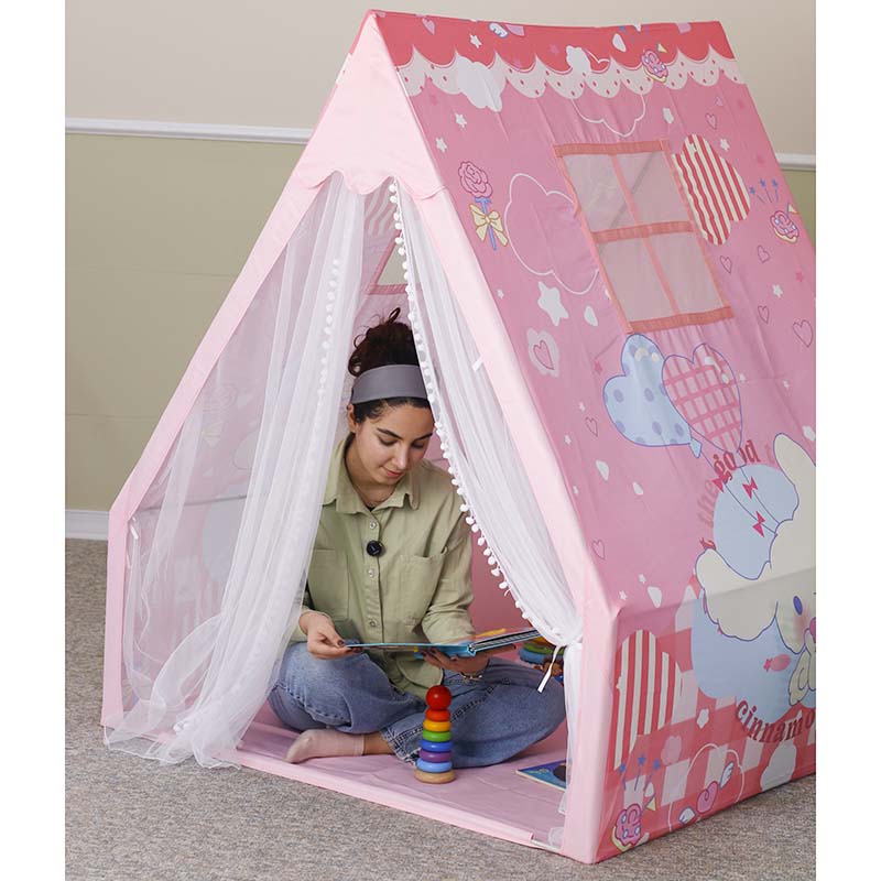 کودکان عاشق بازی در چادر بازی کودک هستند. کودکان میتوانند در چادر بازی کودک مدل سینمارول بازی کنند، رویا ببافند یا در آن خلوت کنند. این چادر بازی کودک با اندازه (طول 120 عمق 120 ارتفاع 150 سانتیمتر) به شکل چادر سرخپوستی طراحی شده است که فضای قابل استفاده زیادی درون آن وجود دارد. فریم اصلی از لولههای پلاستیکی بلند و اتصالات داخلی ساخته شده است. مونتاژ آن بدون هیچ ابزاری و به سادگی انجام میشود و ثبات خوبی را فراهم میکند. پوشش پارچهای با الگوهای اصلی بر روی فریم کشیده میشود و علاوه بر ورودی، دارای پنجره است.