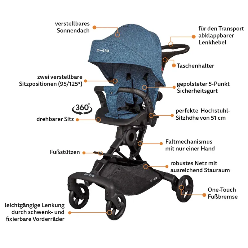 ویژگی کالسکه کودک مایکرو micro trike 360 plus رنگ آبی