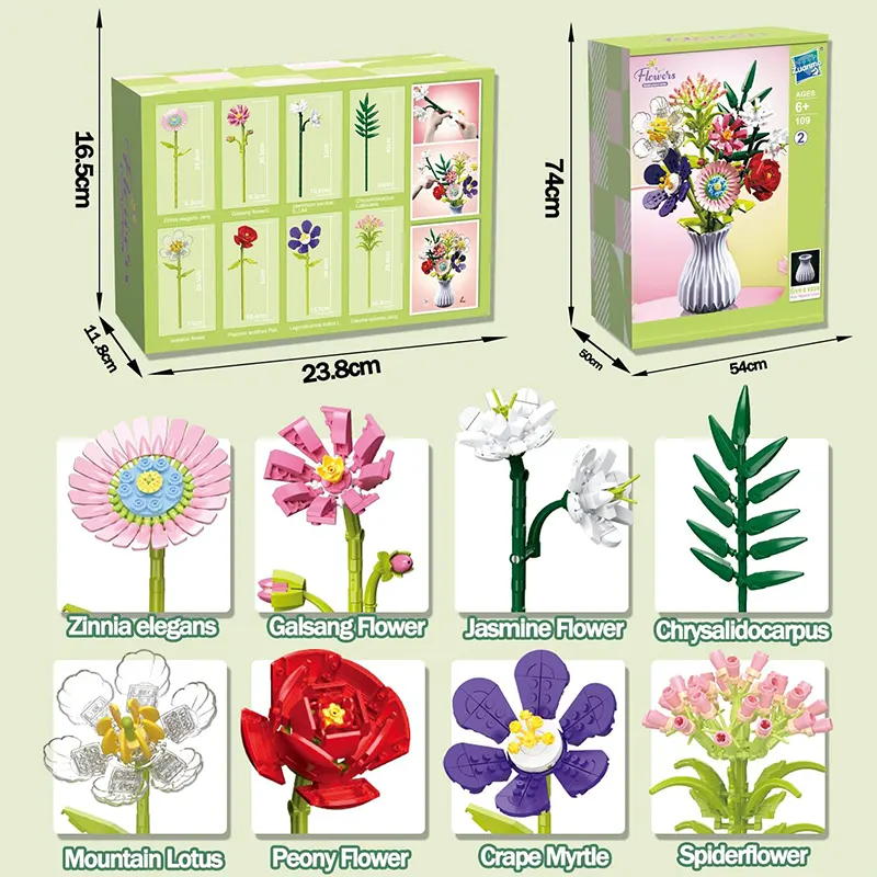 | جنس | گلدان، قطعات برای ساخت 8 شاخه گل لگویی |