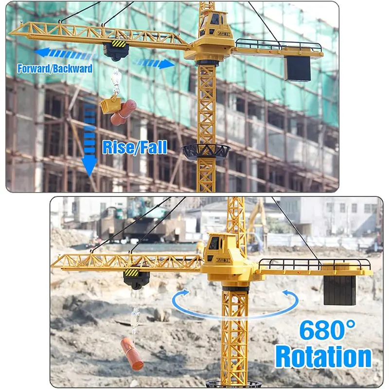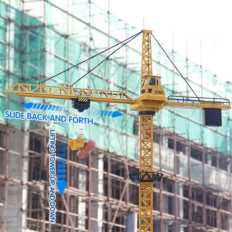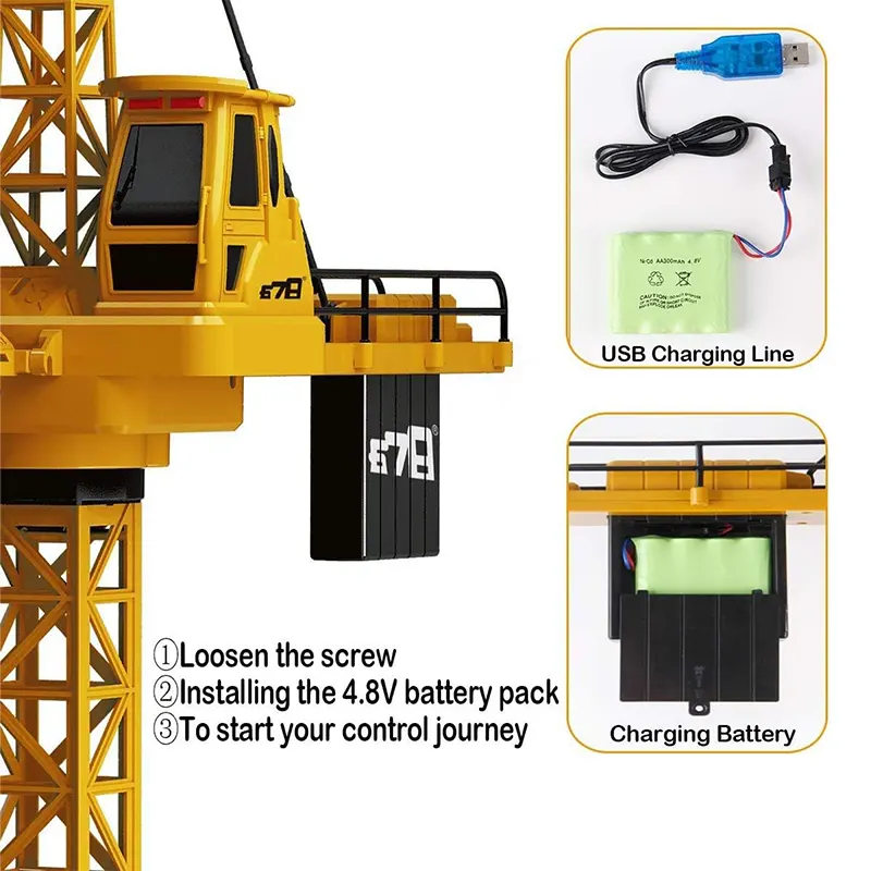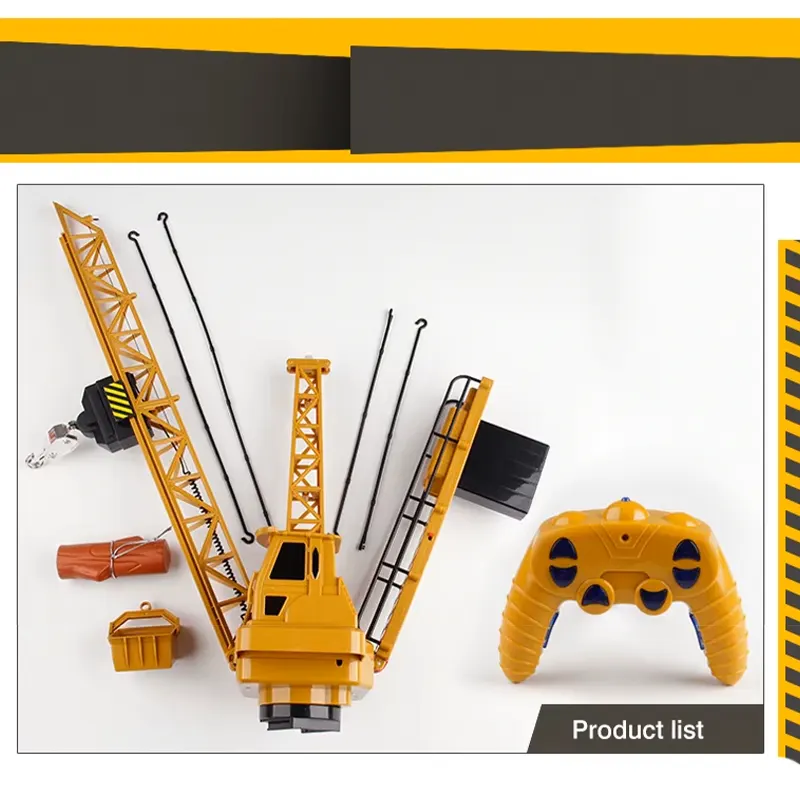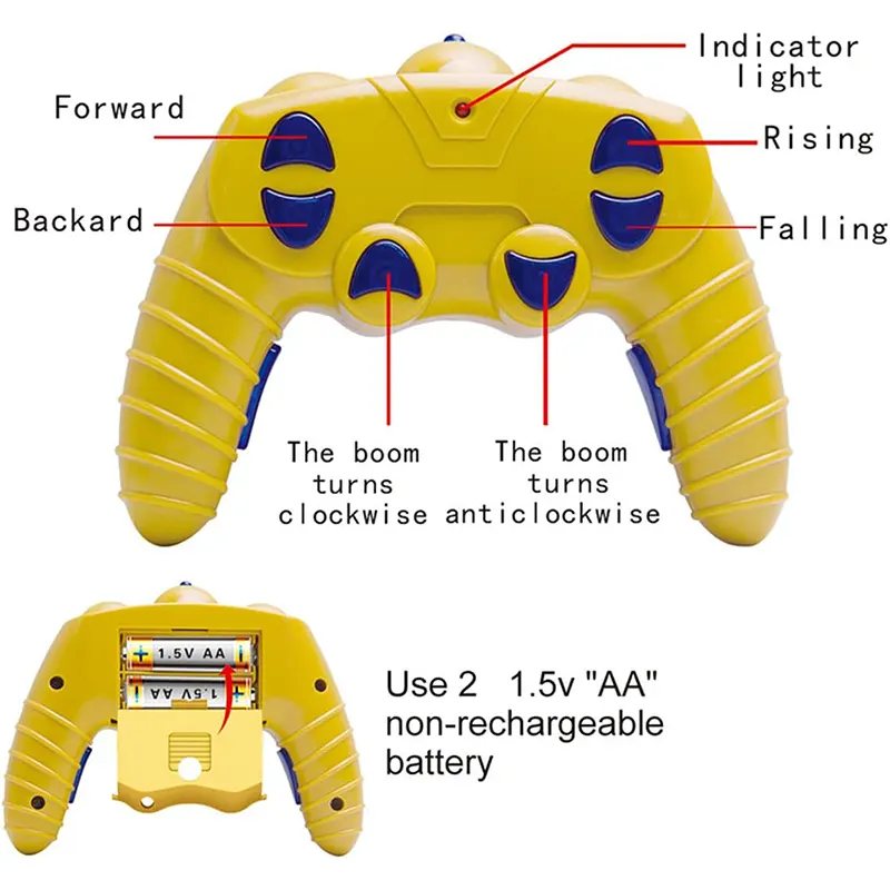این جرثقیل دارای بدنه و پایه های ثابت است که روی زمین قرار می گیرد و قسمت کابین و قسمت بالای این جرثقیل قابلیت چرخش 360 درجه دارد . جرثقیل دارای قلاب بالا برنده می باشد که با کمک کنترل میتوان قلاب و جسمی که به آن آویزان است را به بالا و پایین، چپ و راست حرکت داد. کنترل جرثقیل اسباب بازی با استفاده از 2 عدد باطری 1.5 ولت قابل استفاده است. اسباب بازی جرثقیل برای کودکان عاشق ماشین آلات مهندسی یک انتخاب ایده آل است.