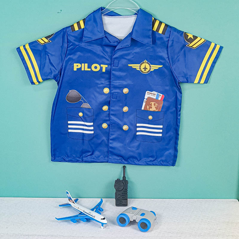 لباس مشاغل کودک مدل خلبان با لوازم یک ست شامل روپوش و لوازمی مانند هواپیما، دوربین شکاری و بی سیم است. این لباس مشاغل برای مهدکودک ها، خانه های مشاغل کودک و خانه بازی ها نیز فوق العاده است. موجب افزایش خلاقیت کودکان و آشنایی آنها با مشاغل مختلف میشود.