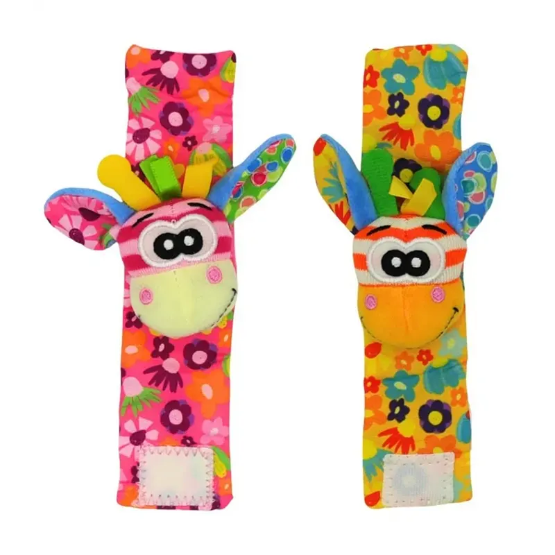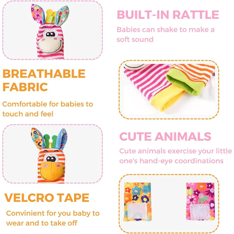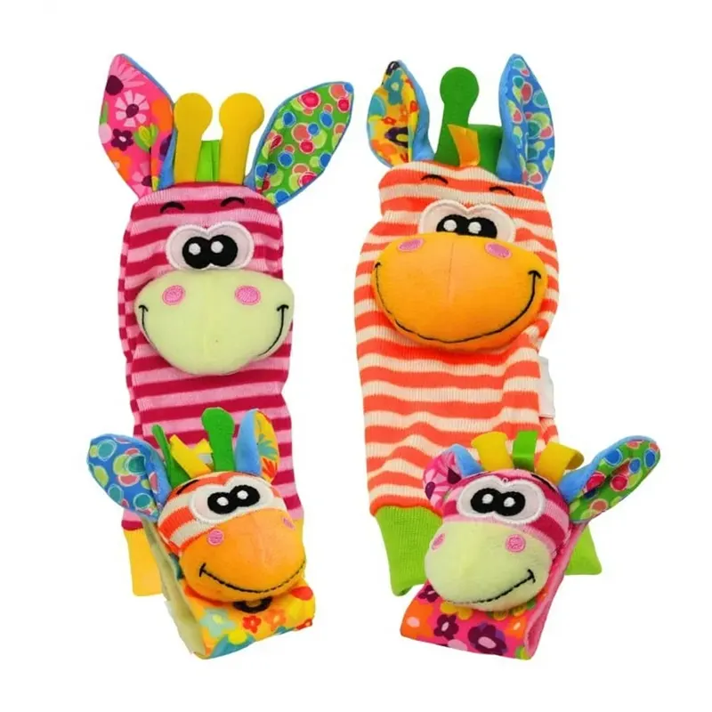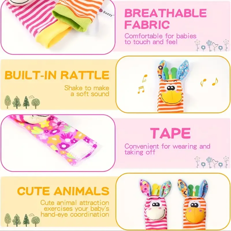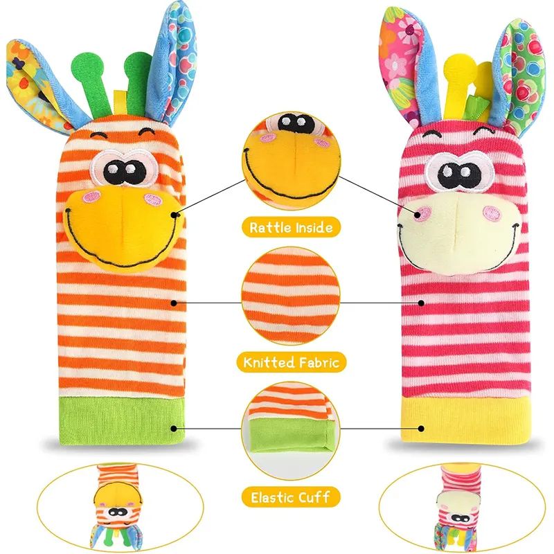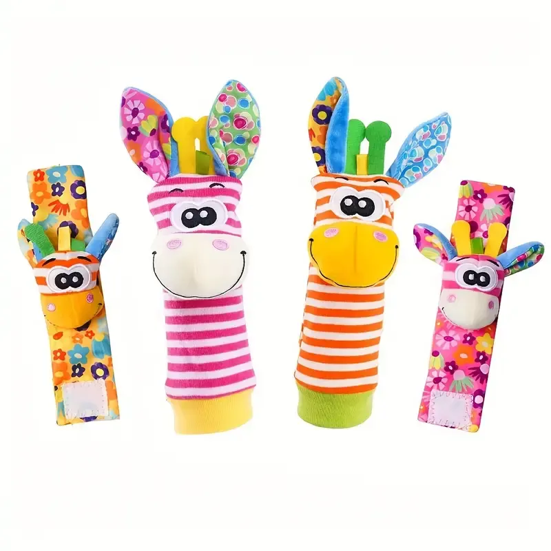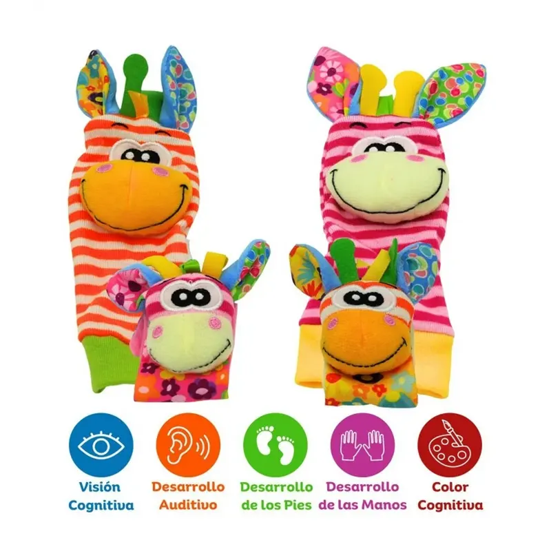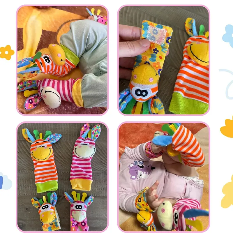 جوراب و مچ بند جغجغه ای کودک طرح حیوانات صورتی نارنجی شامل یک جفت جوراب جغجغه ای به همراه 2 عدد مچ بند جغجغه ای با طرح حیوانات بامزه مثل گورخر و زرافه به رنگ نارنجی و صورتی می باشد. این اسباب بازی مفید از بدو تولد نوزاد قابل استفاده بوده و علاوه بر تاثیر آن بر رشد مهارت های پایه کودک موجب سرگرمی کودک می شود. این جغجغه برای آرام کردن نوزادان و تقویت حواس آنها استفاده می شود و به راحتی به مچ کودک بسته می شود. بازی با جغجغه کودک موجب تقویت حافظه کودک، تقویت مهارت تشخیص و تمایز رنگ ها، تقویت مهارتهای حل مساله و دلیل یابی، افزایش مهارت های دیداری، تقویت مهارتهای شنیداری با صداهایی که با این اسباب بازی تولید می کند، تشخیص بافت و جنس اشیاء با حس لامسه (لمس بافت های گوناگون، گرفتن اشیا و نگه داشتن آن ها)، تقویت هماهنگی بین چشم و دست کودک از طریق گرفتن و حرکت دادن این اسباب بازی و تقویت هوش منطقی با توجه کودک به تفاوت صداها، شکل ها و رنگ ها میشود.