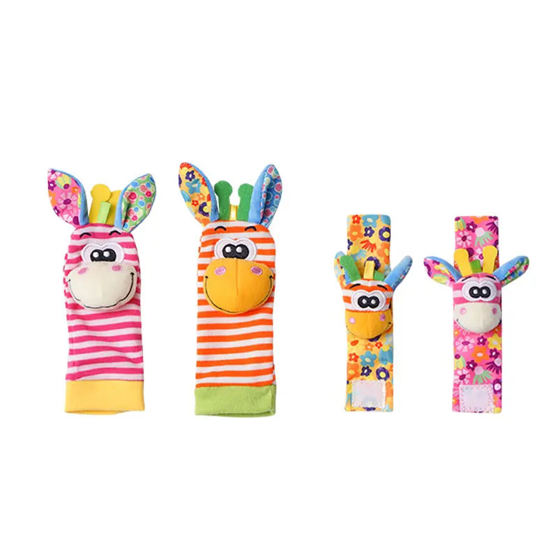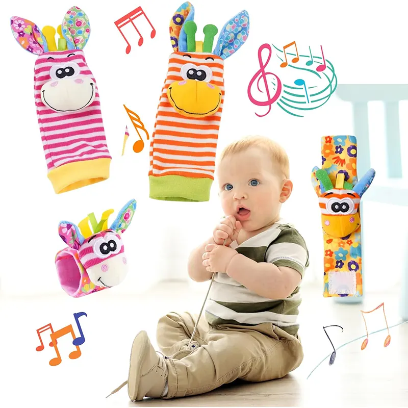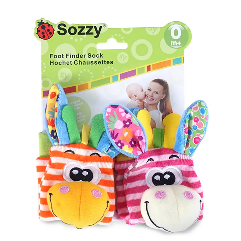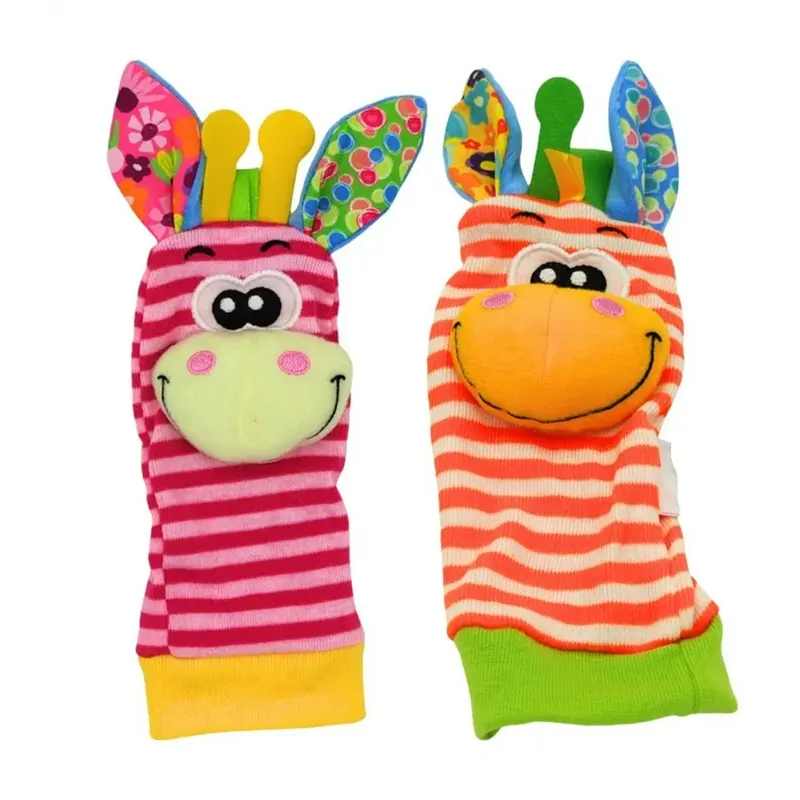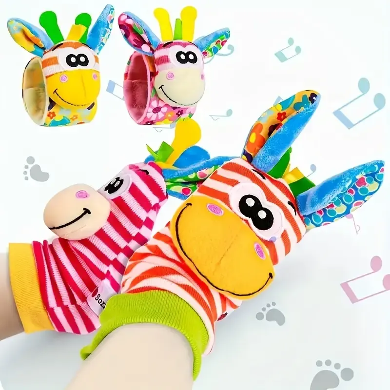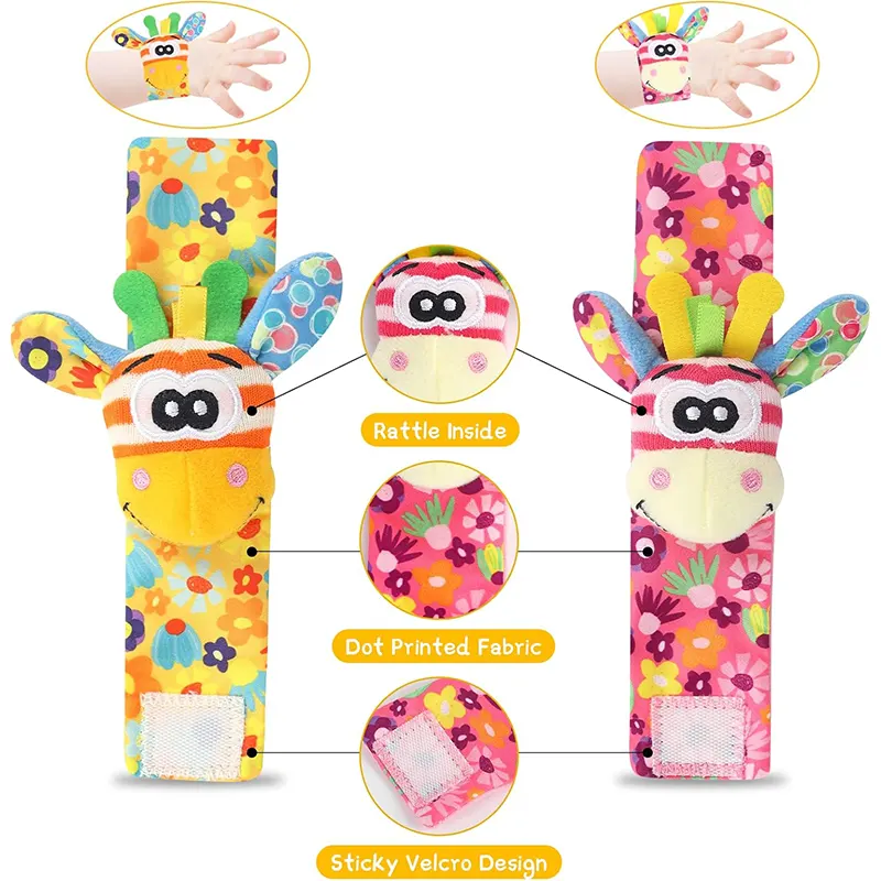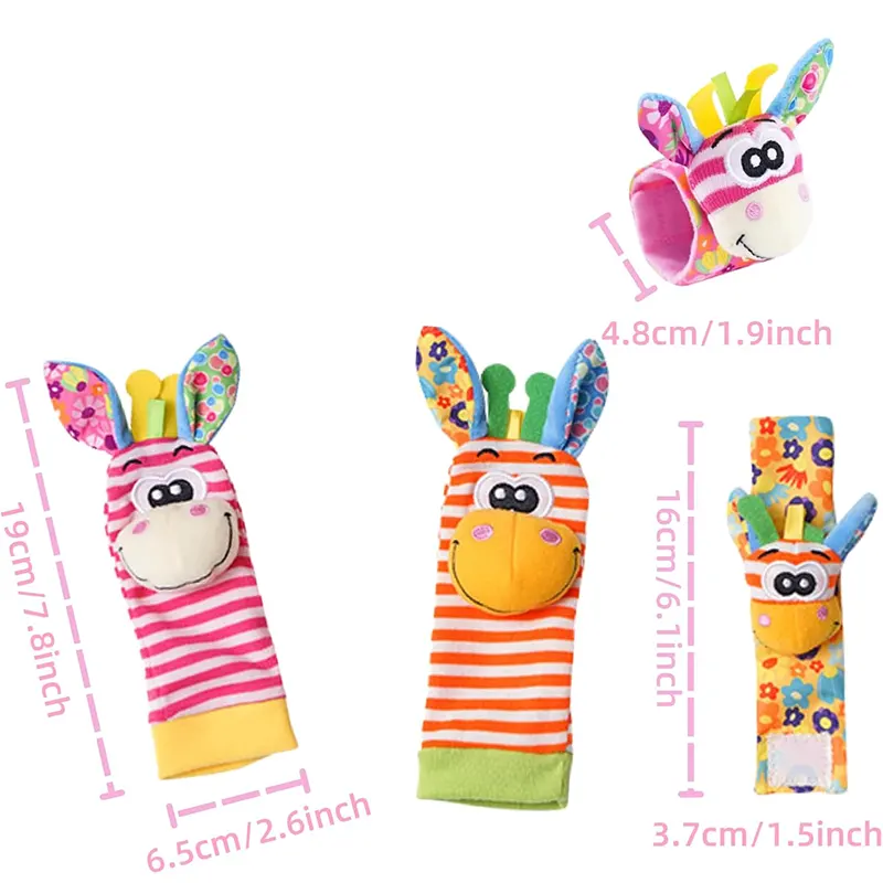 جوراب و مچ بند جغجغه ای کودک طرح حیوانات صورتی نارنجی شامل یک جفت جوراب جغجغه ای به همراه 2 عدد مچ بند جغجغه ای با طرح حیوانات بامزه مثل گورخر و زرافه به رنگ نارنجی و صورتی می باشد. این اسباب بازی مفید از بدو تولد نوزاد قابل استفاده بوده و علاوه بر تاثیر آن بر رشد مهارت های پایه کودک موجب سرگرمی کودک می شود. این جغجغه برای آرام کردن نوزادان و تقویت حواس آنها استفاده می شود و به راحتی به مچ کودک بسته می شود. بازی با جغجغه کودک موجب تقویت حافظه کودک، تقویت مهارت تشخیص و تمایز رنگ ها، تقویت مهارتهای حل مساله و دلیل یابی، افزایش مهارت های دیداری، تقویت مهارتهای شنیداری با صداهایی که با این اسباب بازی تولید می کند، تشخیص بافت و جنس اشیاء با حس لامسه (لمس بافت های گوناگون، گرفتن اشیا و نگه داشتن آن ها)، تقویت هماهنگی بین چشم و دست کودک از طریق گرفتن و حرکت دادن این اسباب بازی و تقویت هوش منطقی با توجه کودک به تفاوت صداها، شکل ها و رنگ ها میشود.