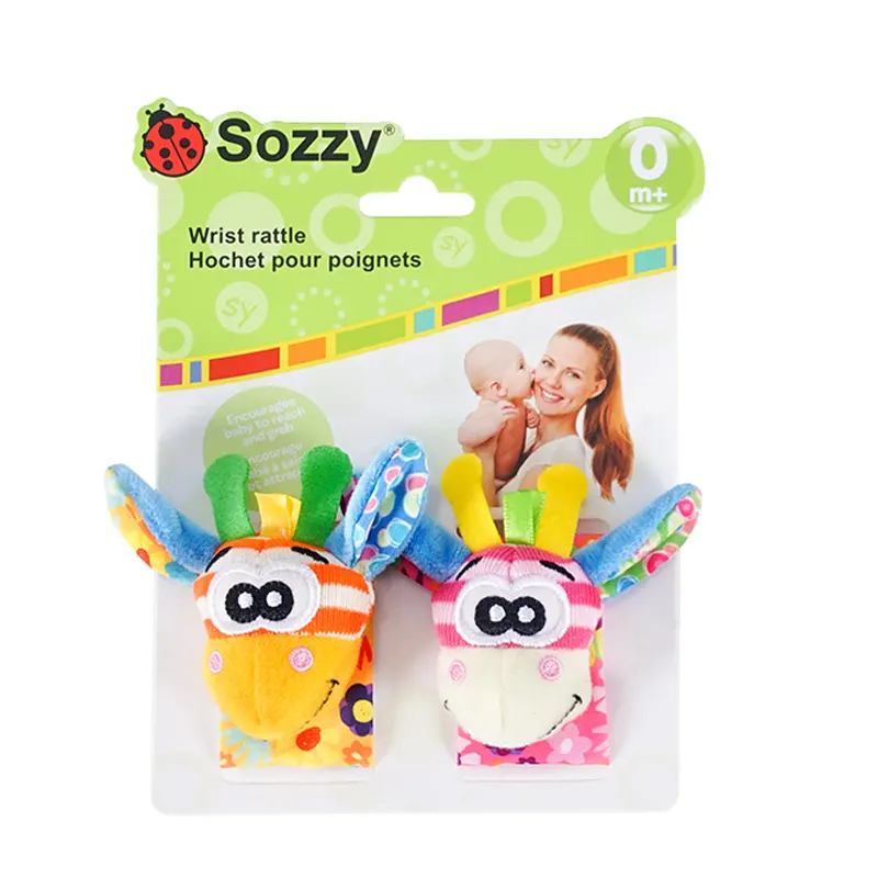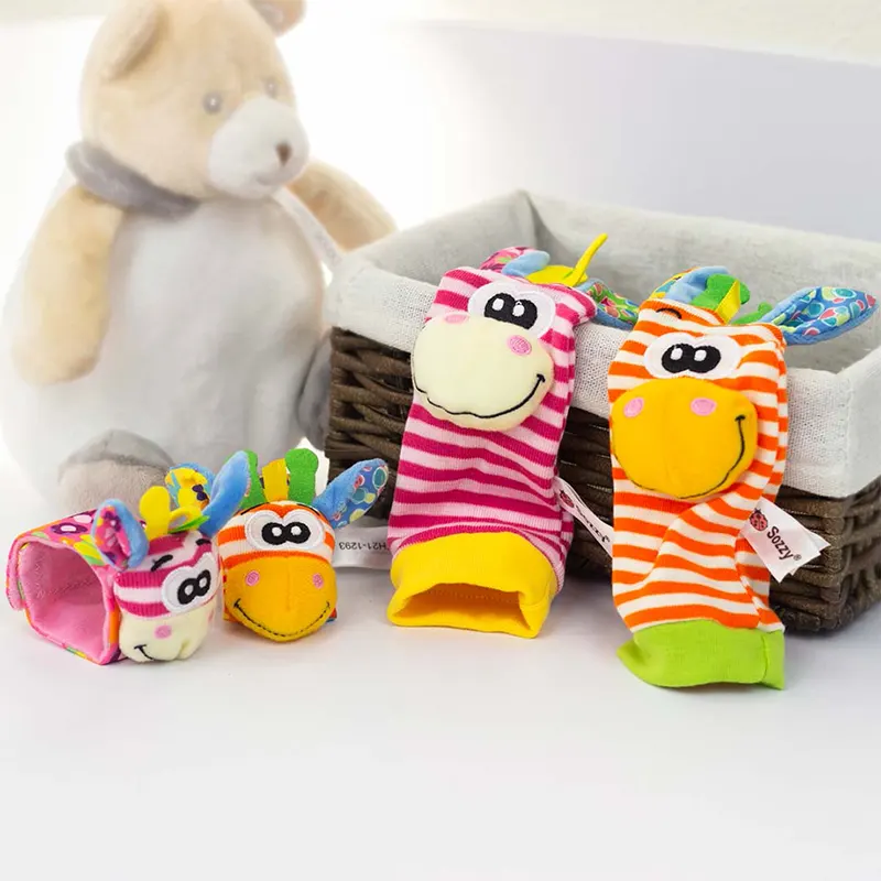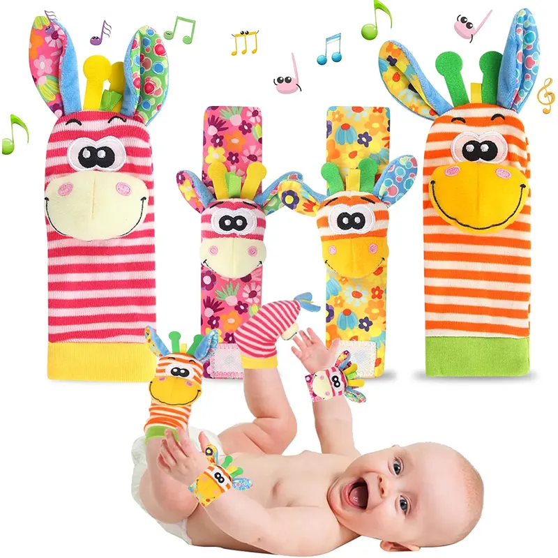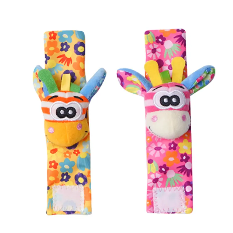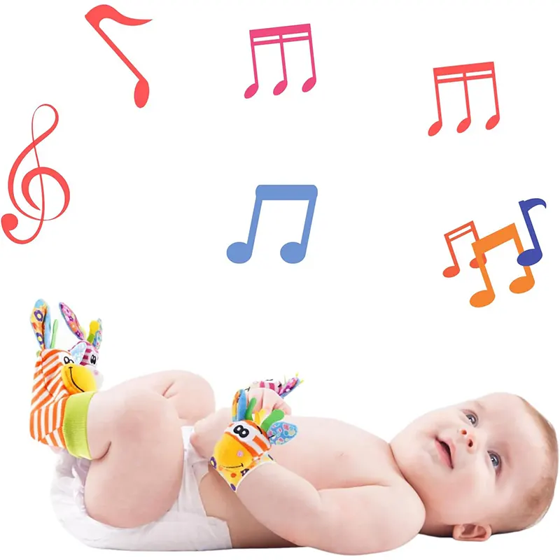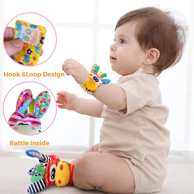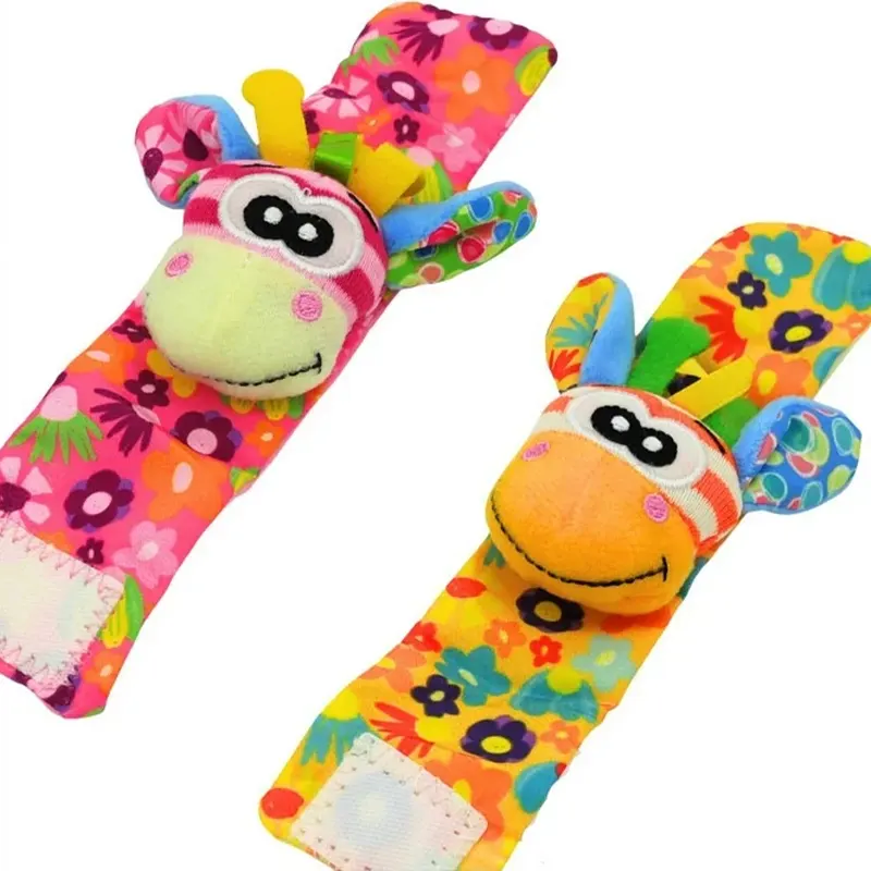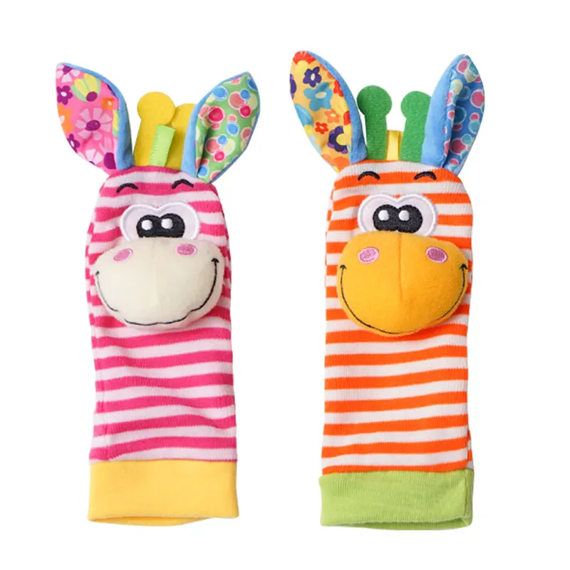 جوراب و مچ بند جغجغه ای کودک طرح حیوانات صورتی نارنجی شامل یک جفت جوراب جغجغه ای به همراه 2 عدد مچ بند جغجغه ای با طرح حیوانات بامزه مثل گورخر و زرافه به رنگ نارنجی و صورتی می باشد. این اسباب بازی مفید از بدو تولد نوزاد قابل استفاده بوده و علاوه بر تاثیر آن بر رشد مهارت های پایه کودک موجب سرگرمی کودک می شود. این جغجغه برای آرام کردن نوزادان و تقویت حواس آنها استفاده می شود و به راحتی به مچ کودک بسته می شود. بازی با جغجغه کودک موجب تقویت حافظه کودک، تقویت مهارت تشخیص و تمایز رنگ ها، تقویت مهارتهای حل مساله و دلیل یابی، افزایش مهارت های دیداری، تقویت مهارتهای شنیداری با صداهایی که با این اسباب بازی تولید می کند، تشخیص بافت و جنس اشیاء با حس لامسه (لمس بافت های گوناگون، گرفتن اشیا و نگه داشتن آن ها)، تقویت هماهنگی بین چشم و دست کودک از طریق گرفتن و حرکت دادن این اسباب بازی و تقویت هوش منطقی با توجه کودک به تفاوت صداها، شکل ها و رنگ ها میشود.