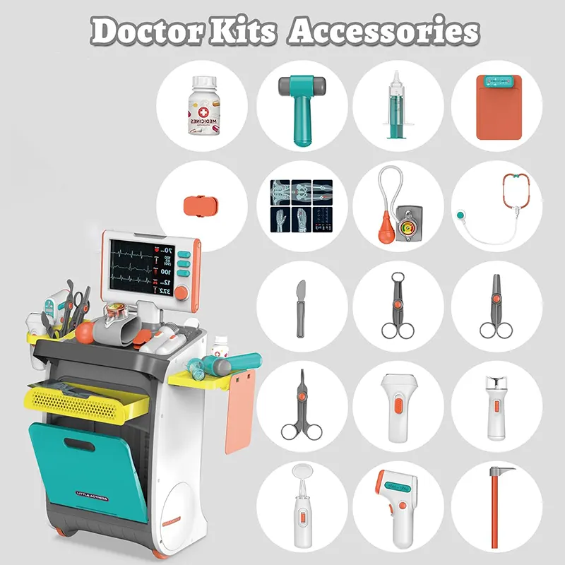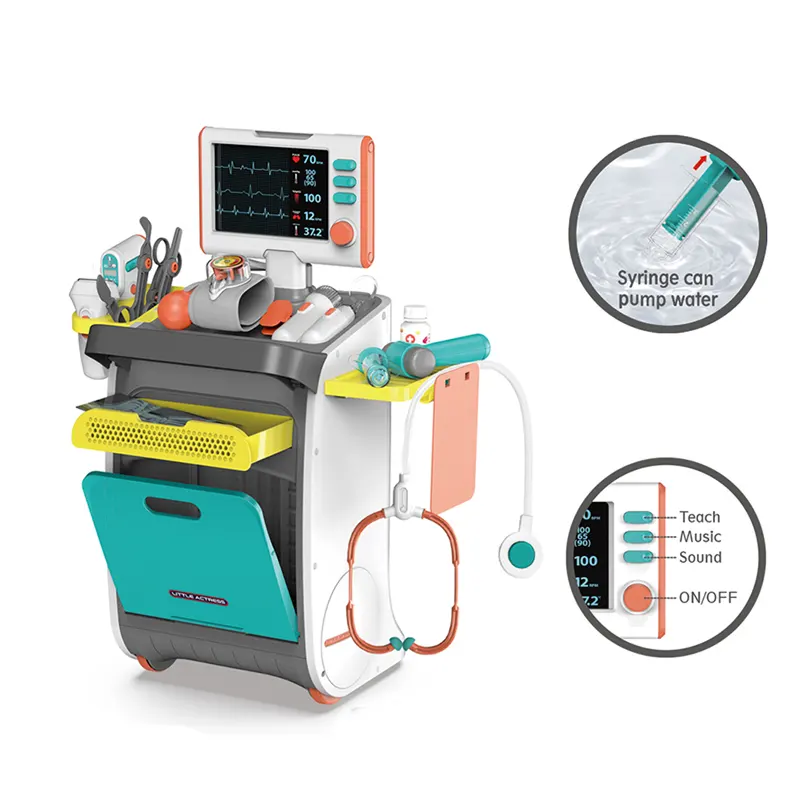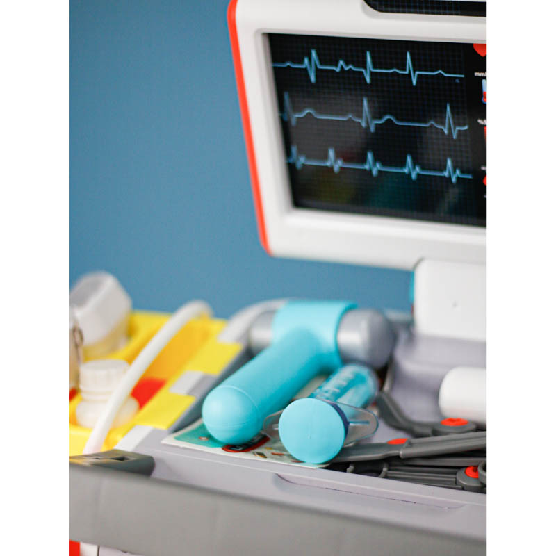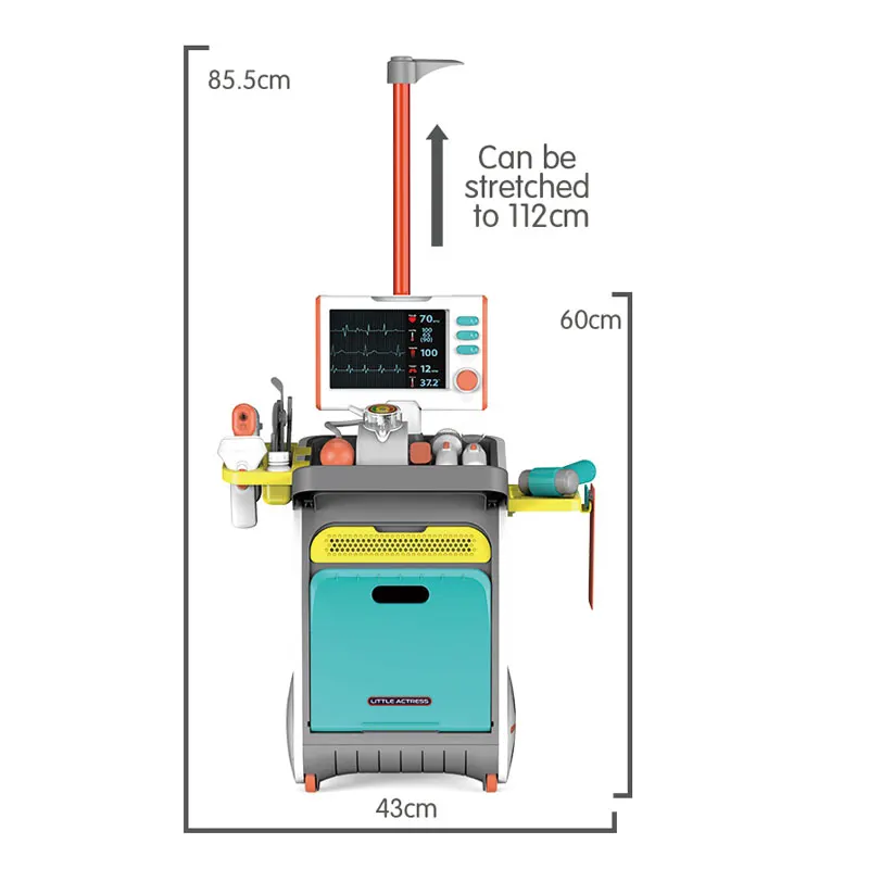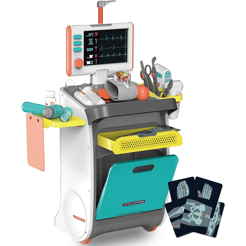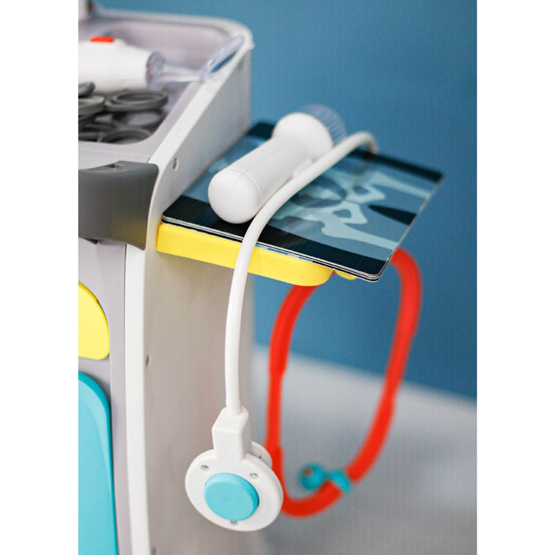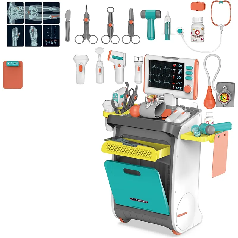 این میز چرخدار جذاب پزشکی یک اسباب بازی آموزشی و بسیار سرگرم کننده برای کودکانی است که دوست دارند در خانه بتوانند نقش آفرینی کنند. کیت پزشکی اسباب بازی کوچولو شامل 22 قطعه پلاستیکی برای ساخت ترولی و همچنین تجهیزات پزشکی مثل عکس MRI، قیچی، قیچ مخصوص جراحی، دستگاه فشار، گوشی پزشکی، آمپول، قرص، چکش رفلکسی، آینه پزشکی، تب سنج و... است. این ترولی پزشکی برای گروه سنی 3 سال به بالا مناسب است. همچنین جنس پلاستیک با کیفیت ABS که فاقد مواد شیمیایی و سمی مثل BPA است و لبه های نرم و بدون تیزی و برندگی آن سلامت و ایمنی این محصول را بالا می برد.