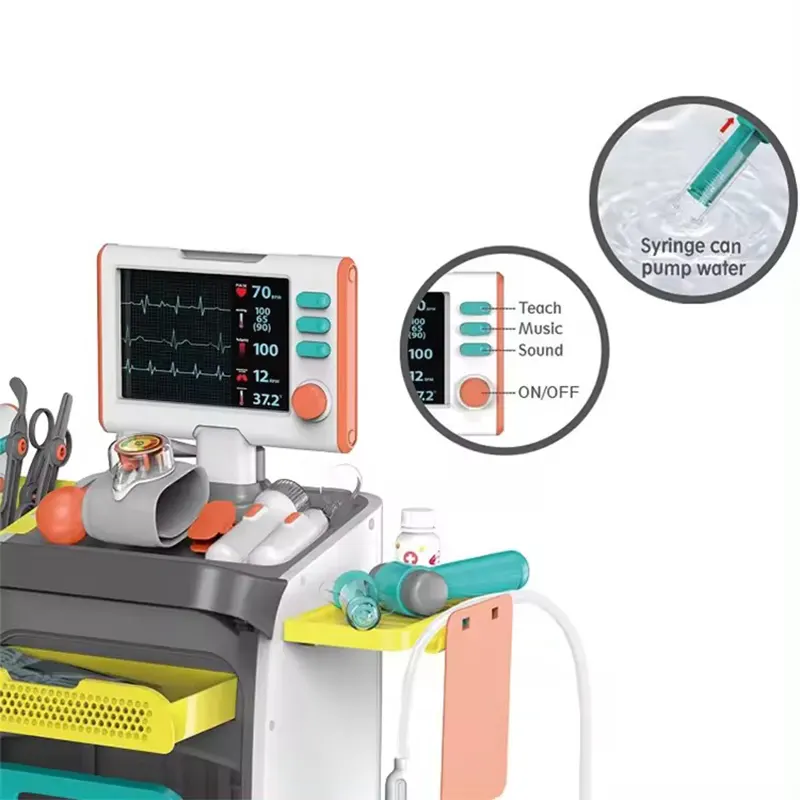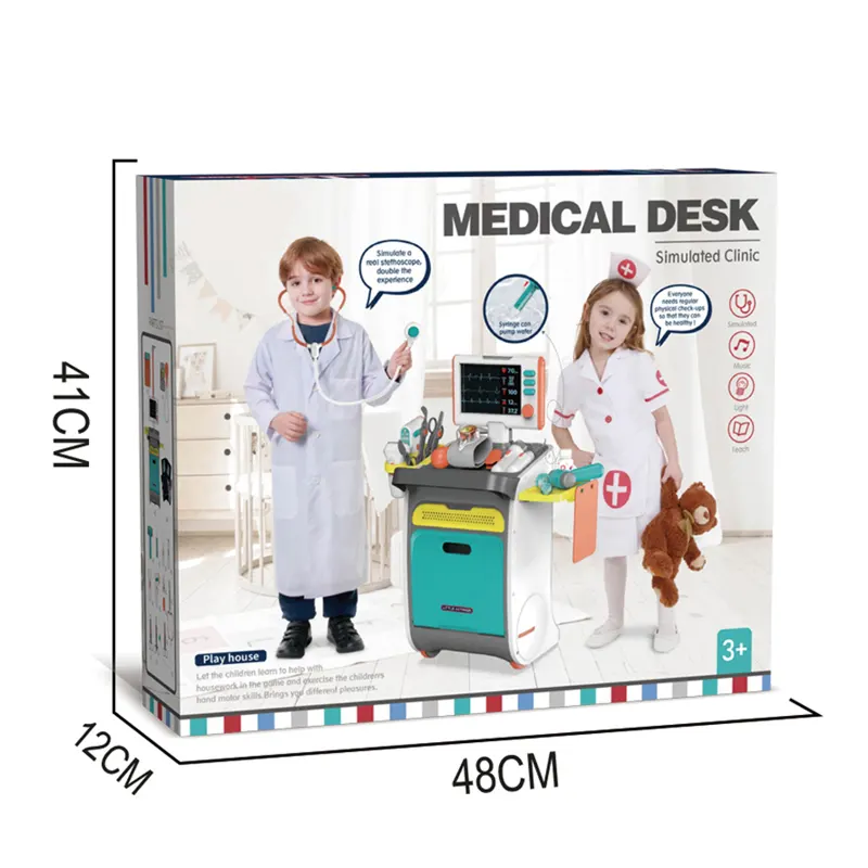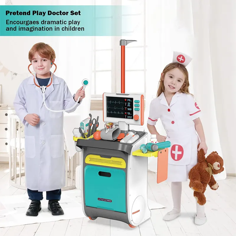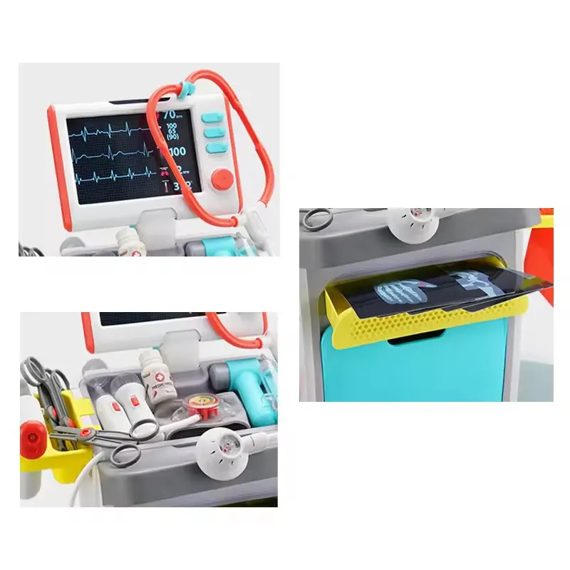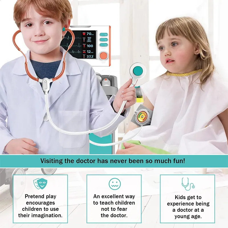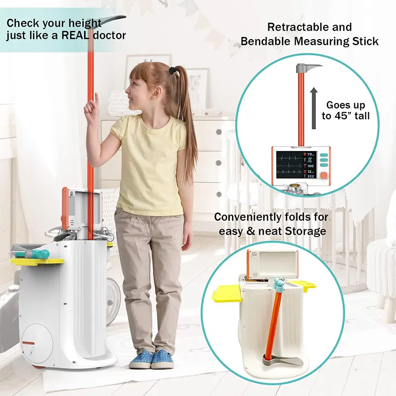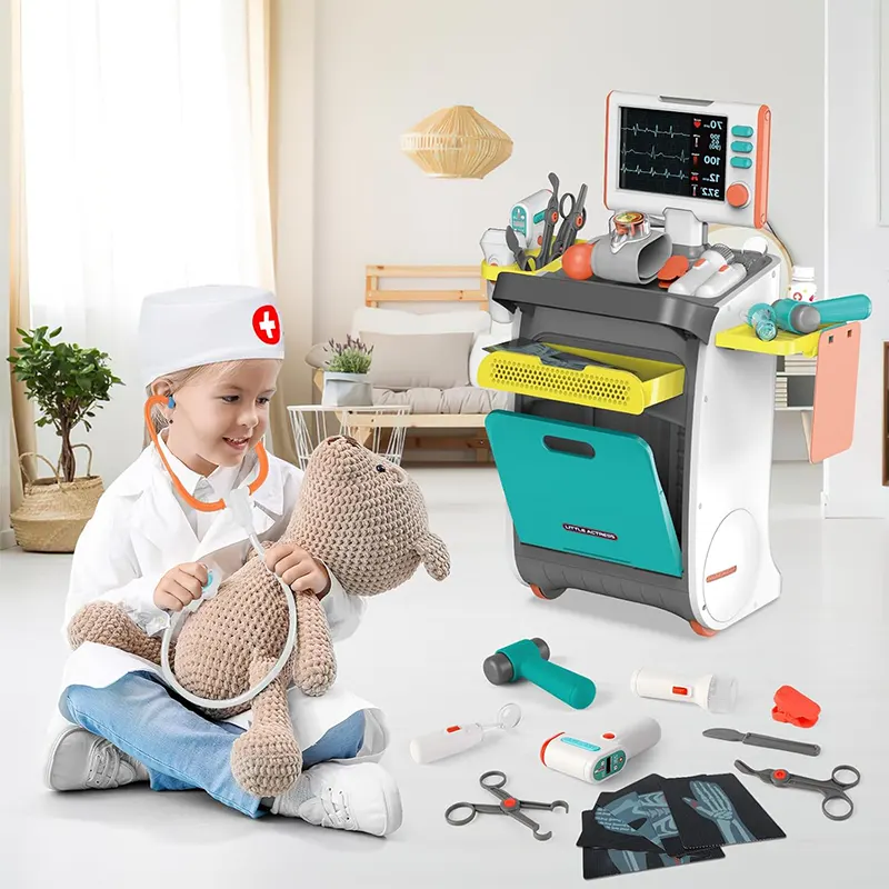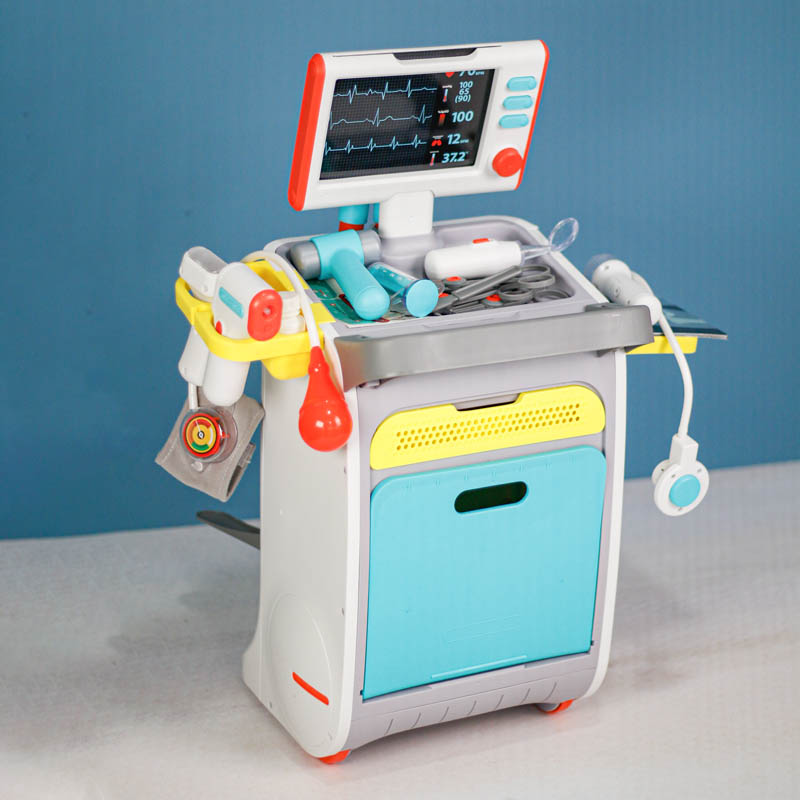 این میز چرخدار جذاب پزشکی یک اسباب بازی آموزشی و بسیار سرگرم کننده برای کودکانی است که دوست دارند در خانه بتوانند نقش آفرینی کنند. کیت پزشکی اسباب بازی کوچولو شامل 22 قطعه پلاستیکی برای ساخت ترولی و همچنین تجهیزات پزشکی مثل عکس MRI، قیچی، قیچ مخصوص جراحی، دستگاه فشار، گوشی پزشکی، آمپول، قرص، چکش رفلکسی، آینه پزشکی، تب سنج و... است. این ترولی پزشکی برای گروه سنی 3 سال به بالا مناسب است. همچنین جنس پلاستیک با کیفیت ABS که فاقد مواد شیمیایی و سمی مثل BPA است و لبه های نرم و بدون تیزی و برندگی آن سلامت و ایمنی این محصول را بالا می برد.
