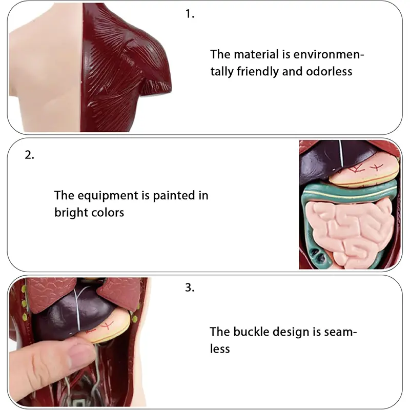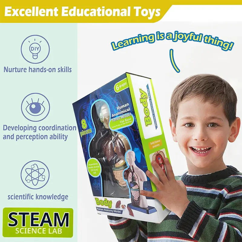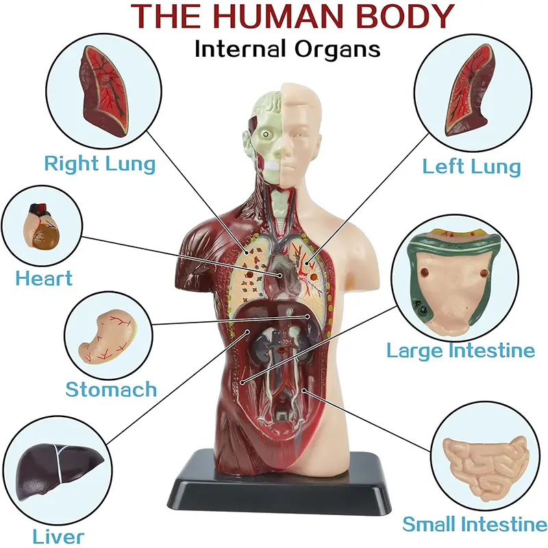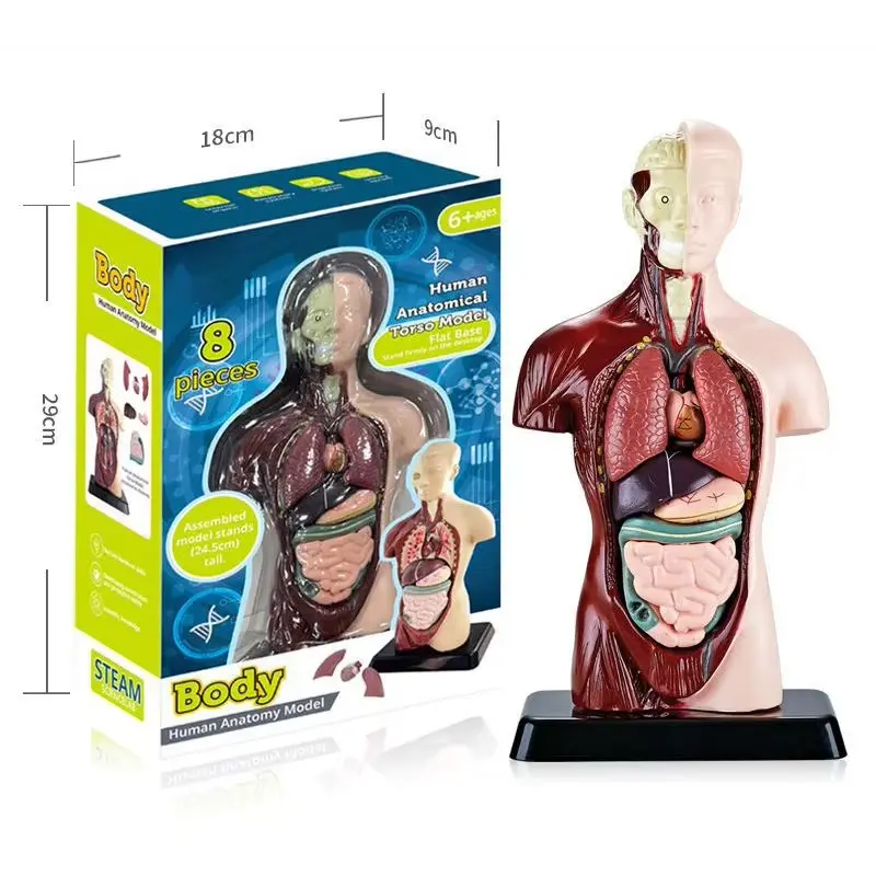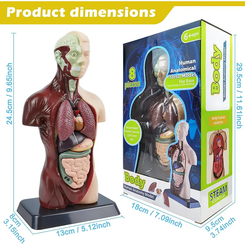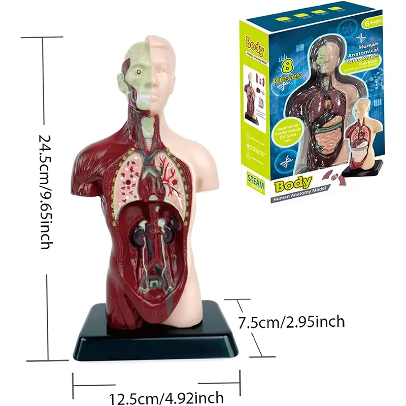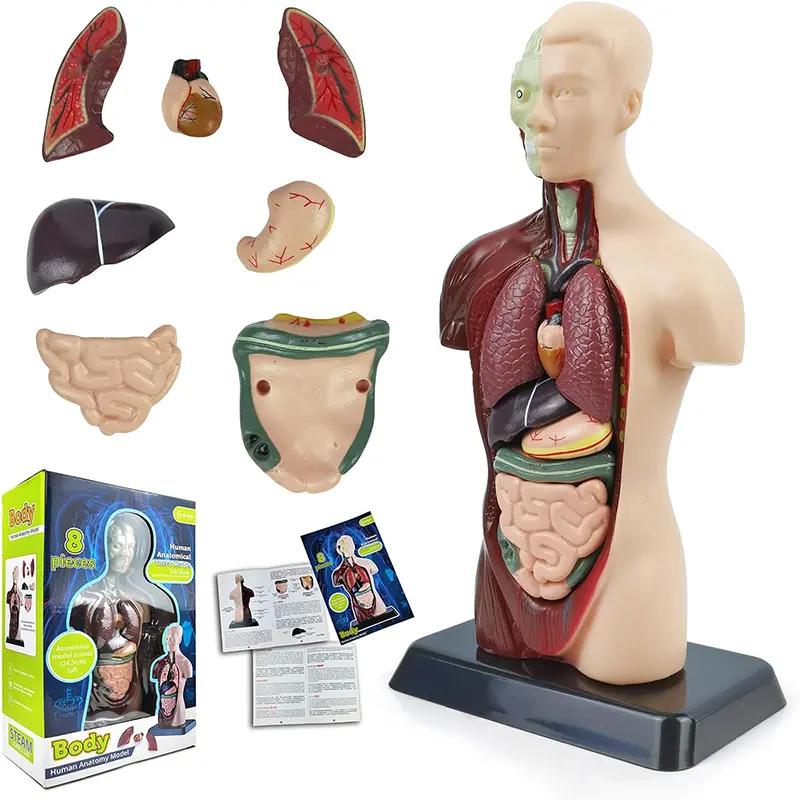 آناتومی بدن انسان یا مولاژ نیم تنه انسان یک وسیله آموزشی برای کودکان و بزرگسالان است که به کمک آن کودکان 6 سال به بالا با اندام های داخلی، شکل، سایز، موقعیت قرار گیری و عملکرد آنها به صورت بهتری آشنا می شوند. مولاژ نیم تنه انسان پیکوتویز از جنس pvc نشکن ساخته شده و 35 سانتی متر ارتفاع دارد و ماهیچه های بدن انسان را نیز نشان می دهد. این مولاژ بدن انسان از رنگ های ثابت و شفاف تشکیل شده و نقاشی شده با دست می باشد.