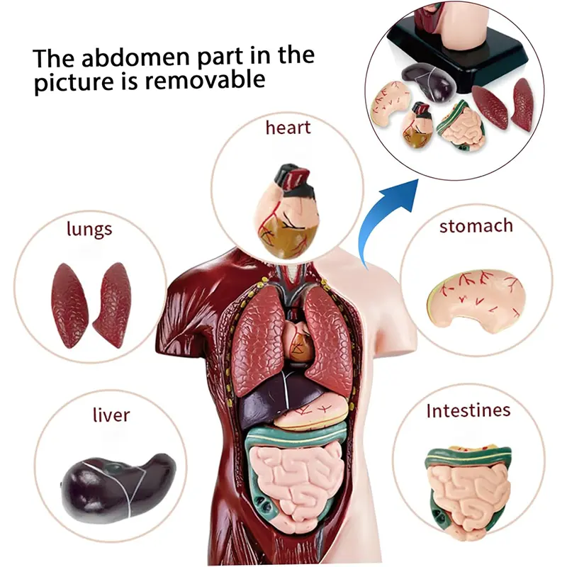 مولاژ نیم تنه بدن انسان شامل 8 تکه از جمله نیم تنه، برش سر و پایه و قطعات جدا شونده آن شامل 2 عدد شش، معده، کبد، قلب و روده ها و... می باشد. این مولاژ احشای شکمی را به خوبی نمایش داده است 23 سانتیمتر ارتفاع دارد و برای آموزش به کودکان 6 سال مناسب است.