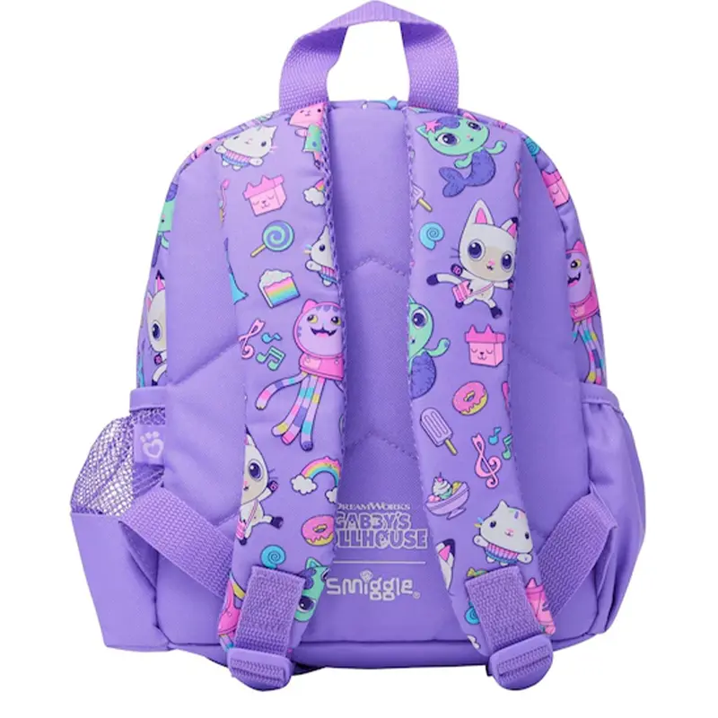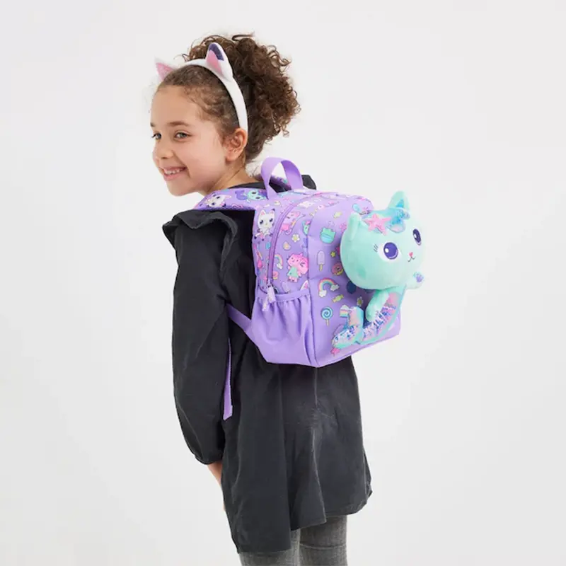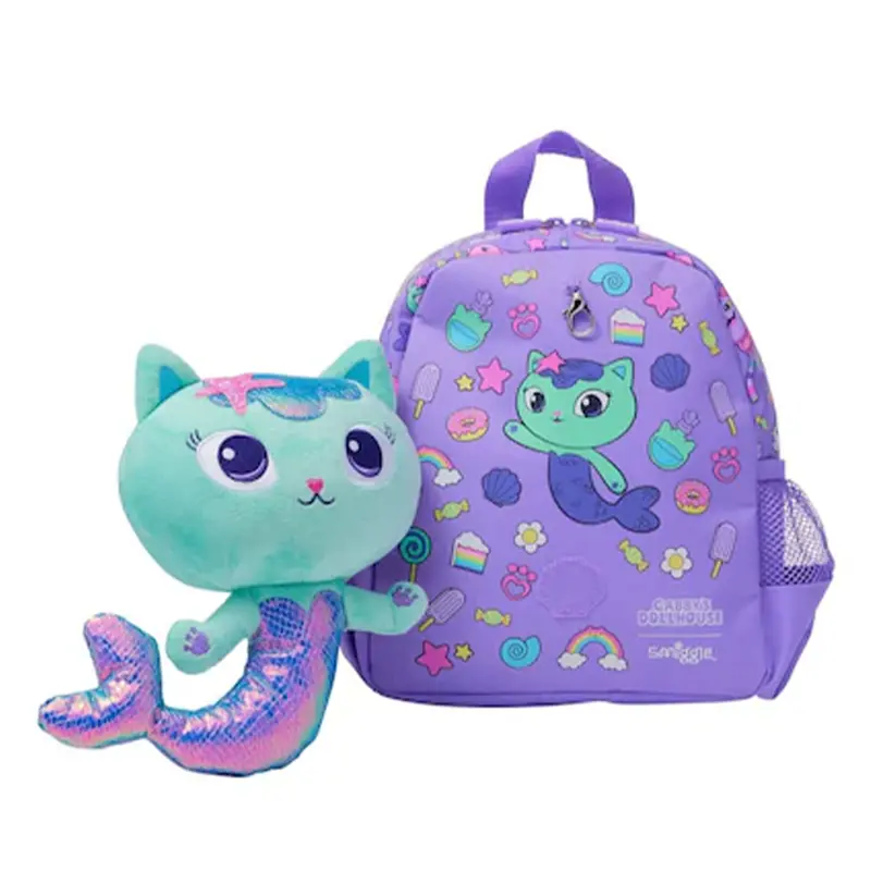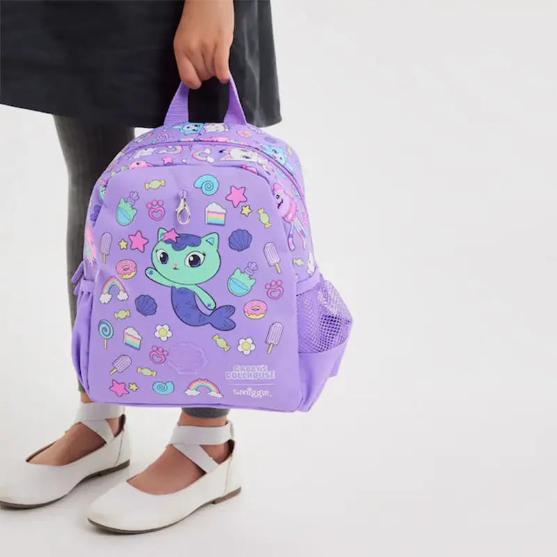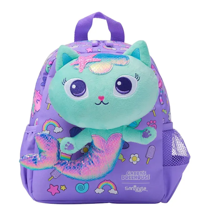 کوله پشتی مهدکودک از برند اسمیگل با طرح گربه پری دریایی (MERCAT smiggle) که یکی از شخصیت های کارتون گبی است. یک کوله پشتی زیبا و جادار مناسب دوران مهدکودک است. این کوله پشتی یک عدد عروسک مرکت پولیشی دارد که قابلیت جدا کردن است و میتواند دوست و همراه کوچولوها باشد، مناسب گروه سنی 1 تا 5 سال است. این کوله پشتی دارای یک دستگیره، بند سر شانه اسفنجی نرم و مشبک با قابلیت تنظیم ارتفاع، یک زیپ بزرگ و کاربردی است؛ همچنین دارای 2 جای قمقمه توری و از جنس کوله پشتی در دو طرف است.