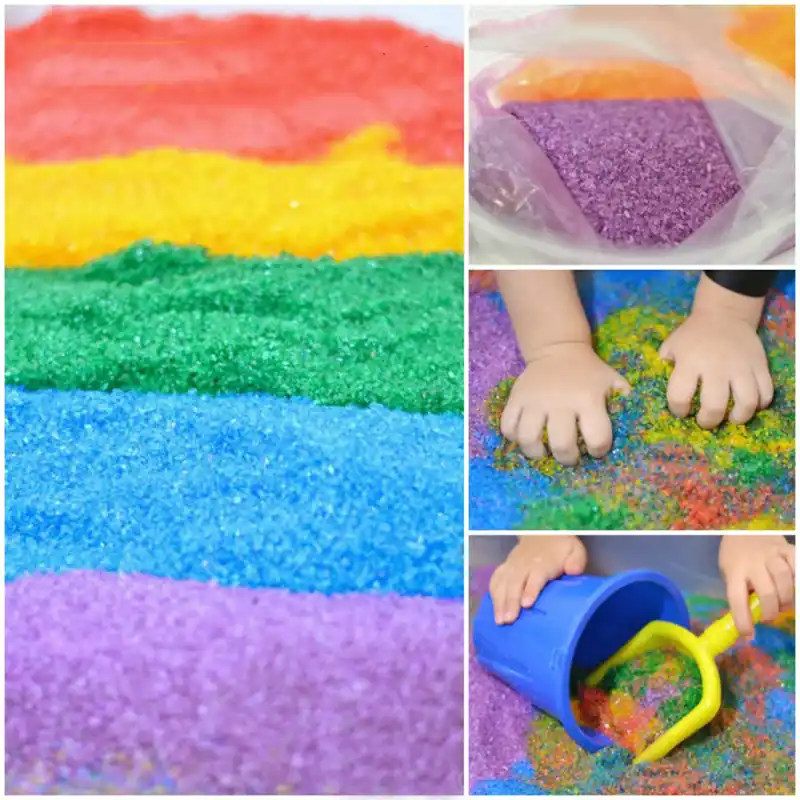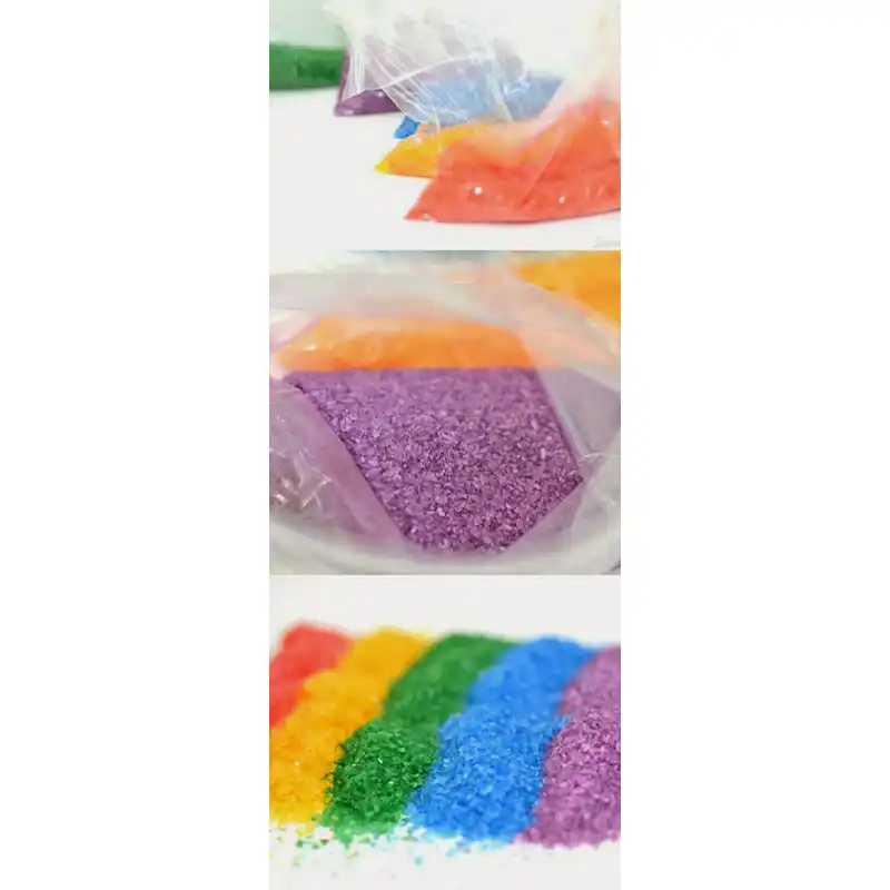 - شن بهداشتی رنگی در تماس با آب حل نمیشوند و قابل استفاده برای کاردستی های ترکیبی هستند.