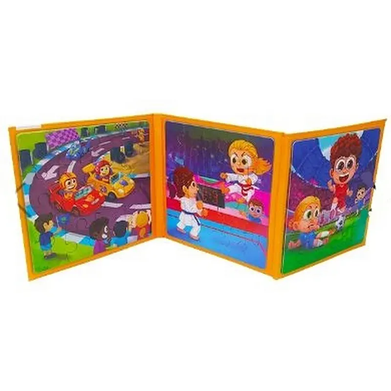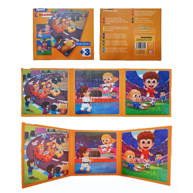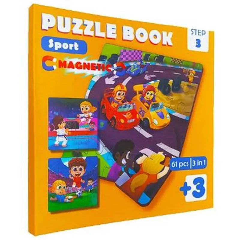 این محصول شامل 3 پازل مگنتی 16 عددی می باشد که یک بازی فوق العاده برای بچه های 3 سال و بالاتر میباشد. این پازل کودک در طرح ورزش: شامل پازل رالی، تکوندو، فوتبال طراحی شده است. این مجموعه شامل یک سطح مغناطیسی تاشو است بنابراین تکه های پازل مگنتی به صفحه میچسبد و امکان سرخوردن و گم شدن تکه های پازل وجود ندارد به همین دلیل نگهداری و حمل آن آسان است. پازل های مگنتی 3 در 1 با مواد غیر سمی چاپ شده و همچنین لبه های گرد آن از آسیب دیدن دست کودکان جلوگیری می کند.