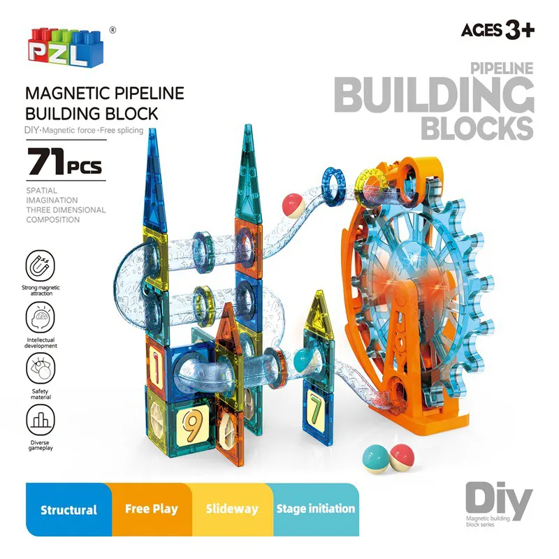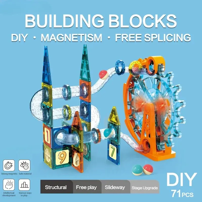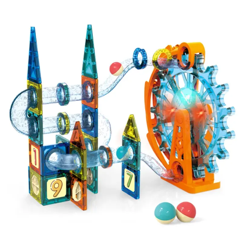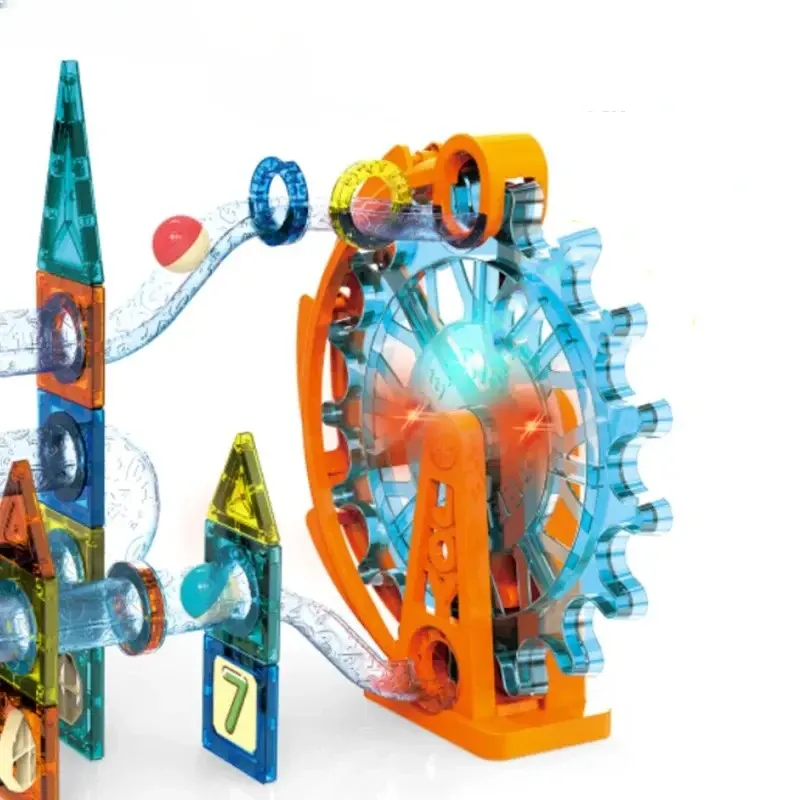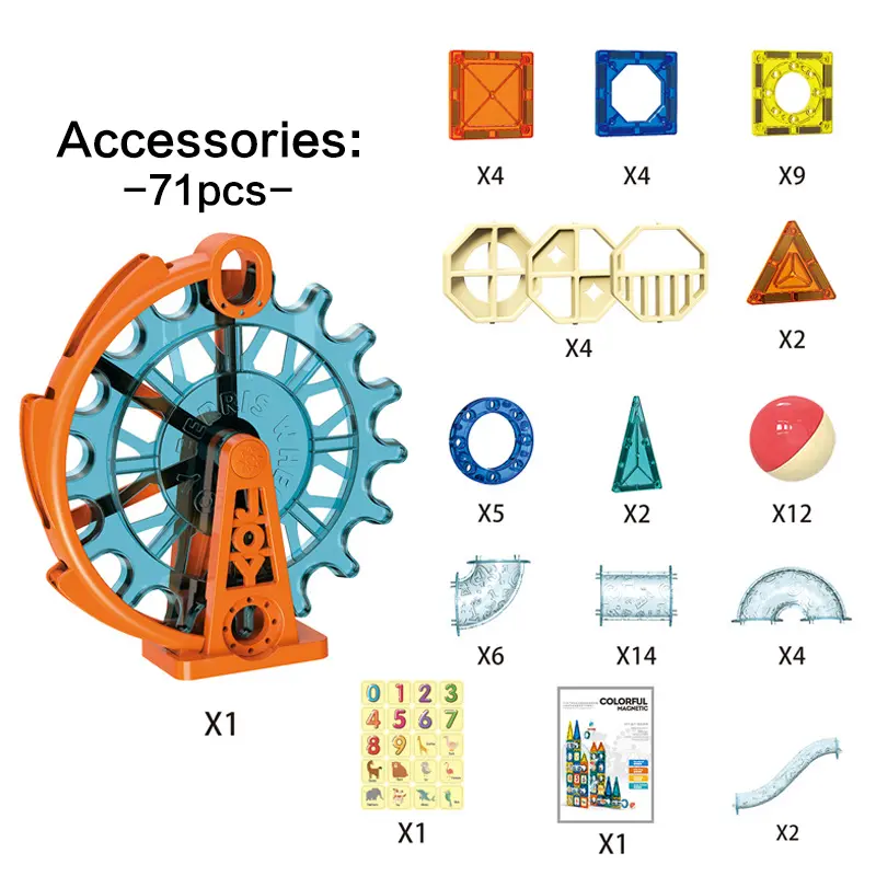 یک بازی هیجان انگیز با کاشی آهنربایی، کاشی مغناطیسی که به همان مگنتیک تایل معروف است دارای 71 تایل آهنربایی است که توسط نیروی مگنتی به هم متصل می شوند. این اسباب بازی جدید یک اسباب بازی ترند این روز هاست و به عنوان اسباب بازی دخترانه و اسباب بازی پسرانه محبوب شده است. کاشی مغناطیسی 71 تکه برای گروه سنی 3 سال به بالا مناسب است و دارای یک چرخ و فلک بزرگ و موزیکال است که با 3 عدد باتری قلمی روشن میشود و به دور خود میچرخد. کودک میتواند با کمک خلاقیت خودش سازه های دو بعدی و سه بعدی بسازد یا یک شهرک زیبا با چرخ و فلک و کاشی های مگنتی بسازد. این چرخ و فلک با چرخش به دور خودش توپ ها را در مسیر ریل های پلاستیکی به حرکت در میاورد. مگنتیک تایل ها یک سری کاشی های مربعی یا مثلثی از جنس پلاستیک شفاف رنگی هستند که در بین آنها قطعه های آهنربا قرار دارد. کودک با قرار دادن قطب های موافق و مخالف این کاشی ها روی هم با مفهوم جاذبه و دافعه آشنا می شوند. این مجموعه شامل 71 قطعه (چرخ و فلک، 4 تایل مربعی، 4 تایل مربعی با حفره شش ضلعی، 9 تایل مربعی با حفره دایره شکل، 2 مثلث متوازی الاضلاع، 5 تایل دایره شکل، 2 تایل متساوی الساقین، 4 شش ضلعی، 4 مسیر پلاستیکی نیم دایره، 6 مسیر پلاستیکی منحنی، 2 مسیر پلاستیکی سرسره ای، 14 مسیر پلاستیکی صاف، 12 توپ کوچک) می باشد.