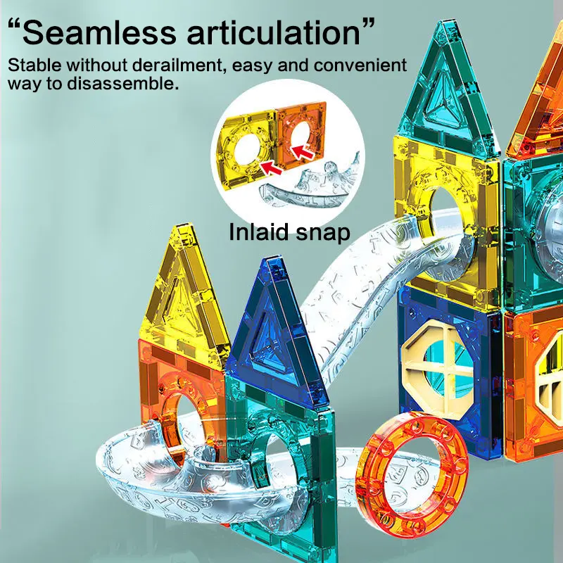 - قطعات اسباب بازی مگنتیک تایل، آهنربایی هستند و با جاذبه مغناطیسی به هم می چسبند.