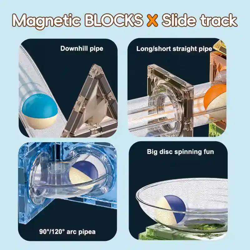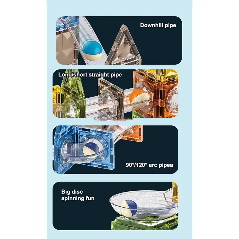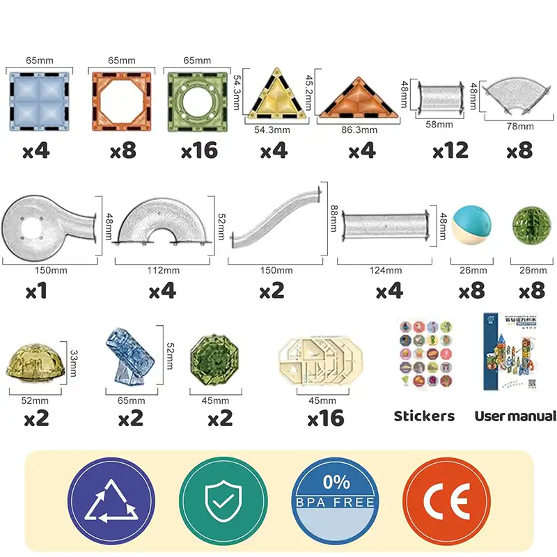 - تعداد قطعات 105 تکه 28 قطعه مربعی، 4 قطعه مثلثی متساوی الاضلاع، 4 قطعه مثلثی متساوی الساقین، 1 رابط منحنی، 4 نیم دایره، 4 سرسره منحنی، 4 سرسره صاف بلند و 12 سرسره کوتاه و...