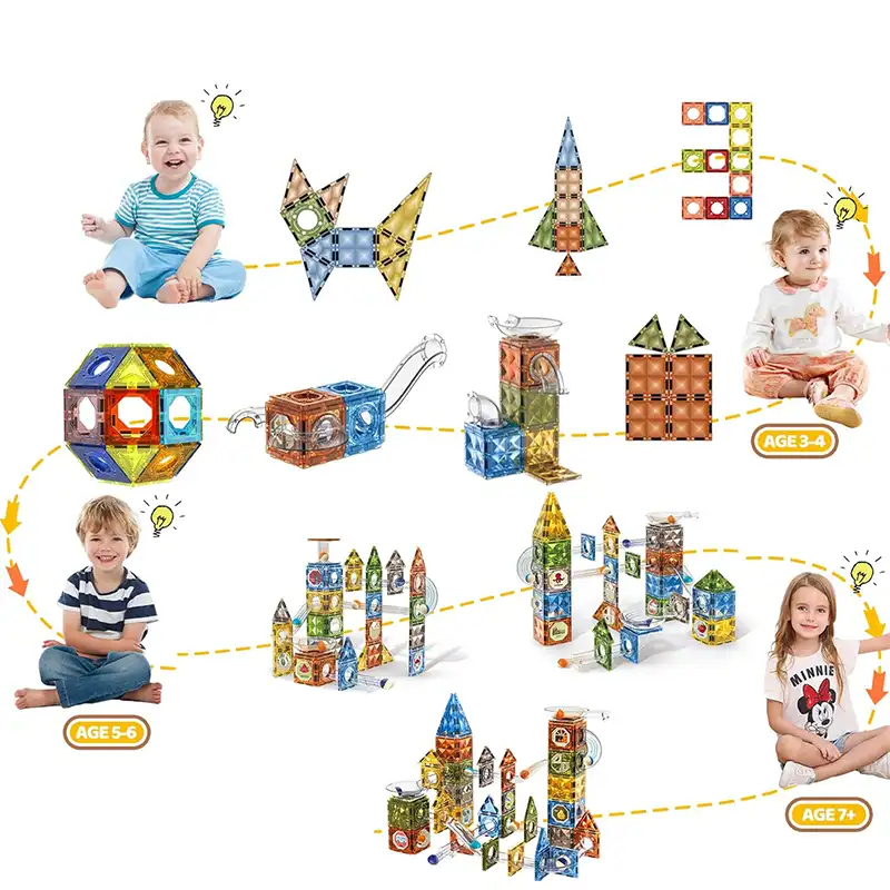 اسباب بازی Magnetic Tiles، کاشی مغناطیسی، مگنتیک تایل یا لگو مگ از قطعات پلاستیکی ساخته شده اند که درون آن آهنربا قرار دارد. کودکان میتوانند بر اساس خلاقیت خودشان سازه های دو بعدی و سه بعدی بسازند و هوش فضایی خود را تقویت کنند به عنوان مثال یاد میگیرند یک مکعب دارای 6 وجه است. کاشی مغناطیسی چراغدار از 105 تکه آهنربایی در اشکال مربع، مثلث، سرسره های ساده، نیم دایره و... است که کودک با در کنار هم قرار دادن آن سازه های مختلفی را می سازد و توپ های رنگی و چراغدار را در این مسیر هدایت میکند.