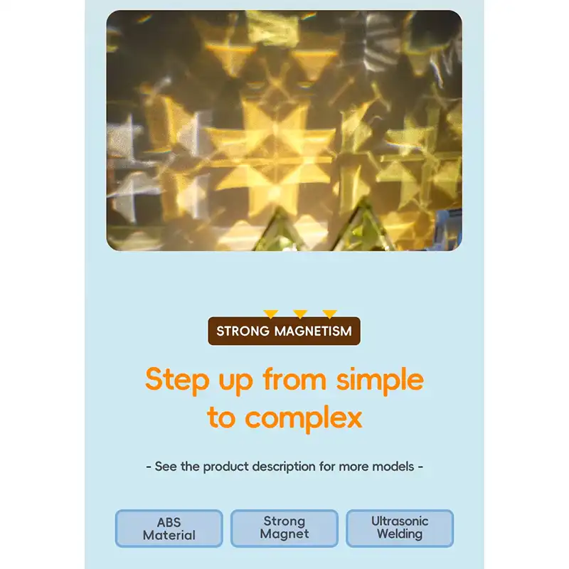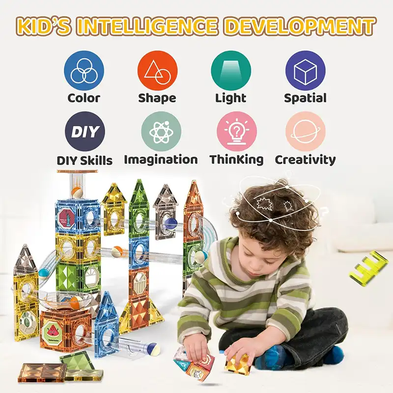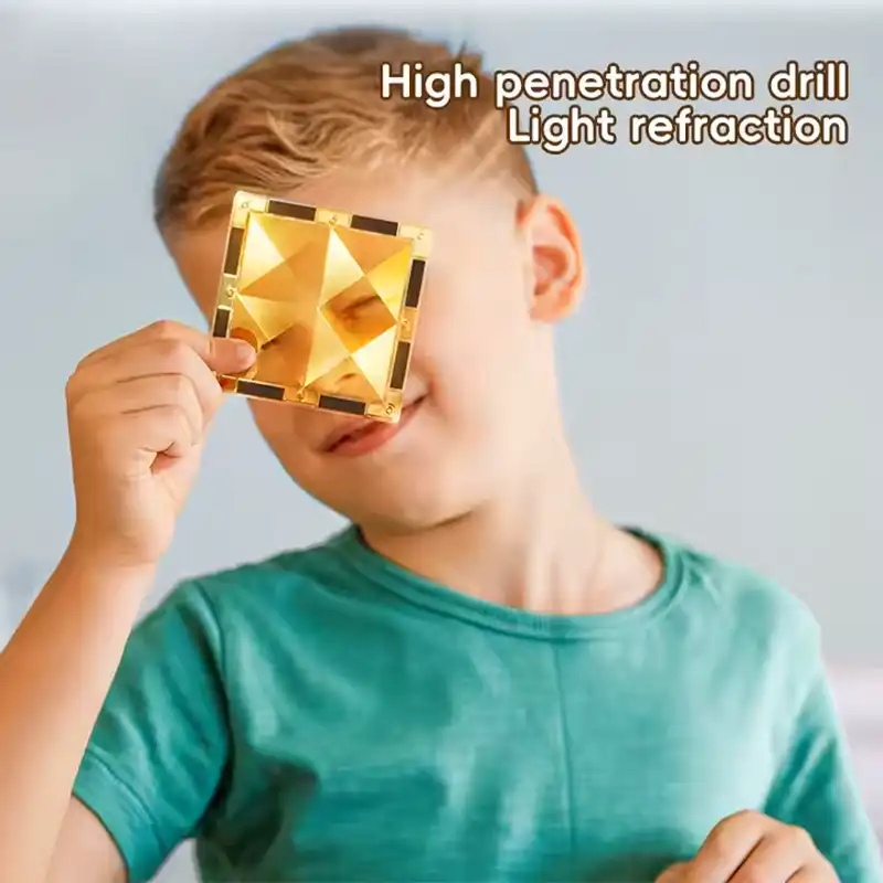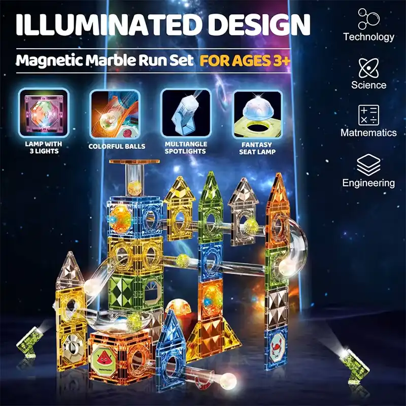 اسباب بازی مگنتیک تایل چراغدار یک اسباب بازی آموزشی و ساختنی فوق العاده برای کودکان بالای 3 سال است، همچنین 2 پروژکتور، 4 چراغ چشمک زن و 8 چراغ رنگی وجود دارد که مسیر حرکت توپ و سازه ها را بسیار زیباتر میکند.