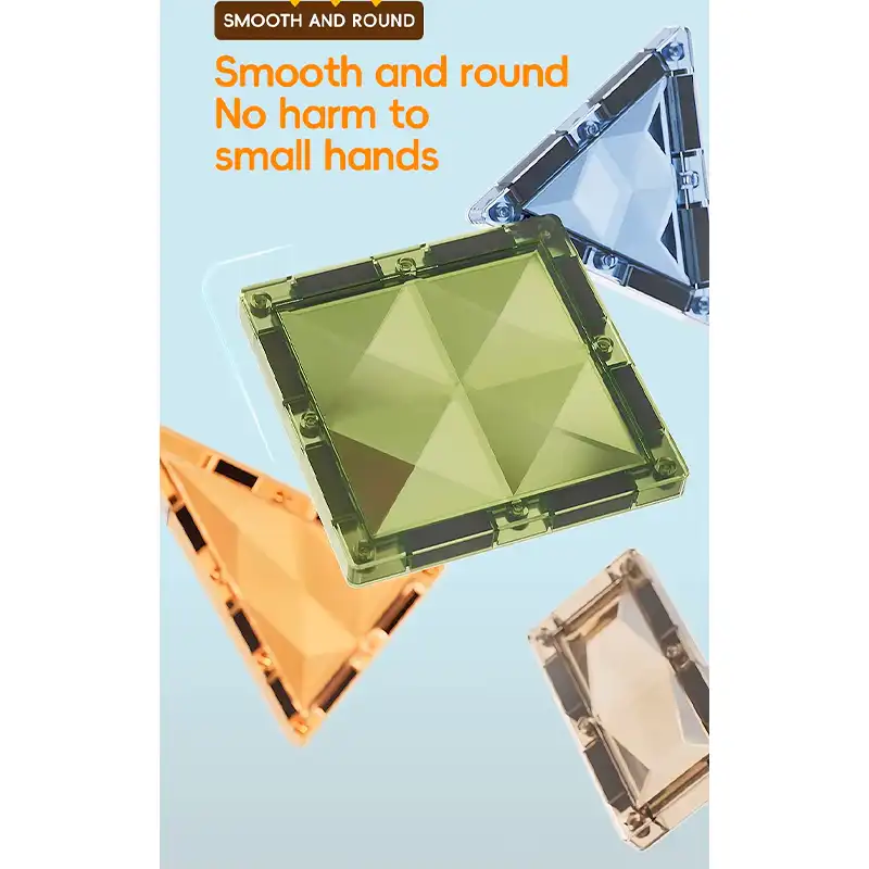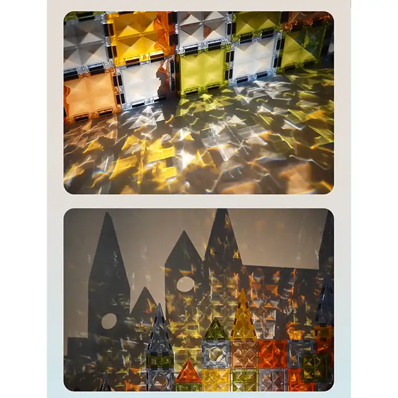- قطعات اسباب بازی مگنتیک تایل، آهنربایی هستند و با جاذبه مغناطیسی به هم میچسبند.