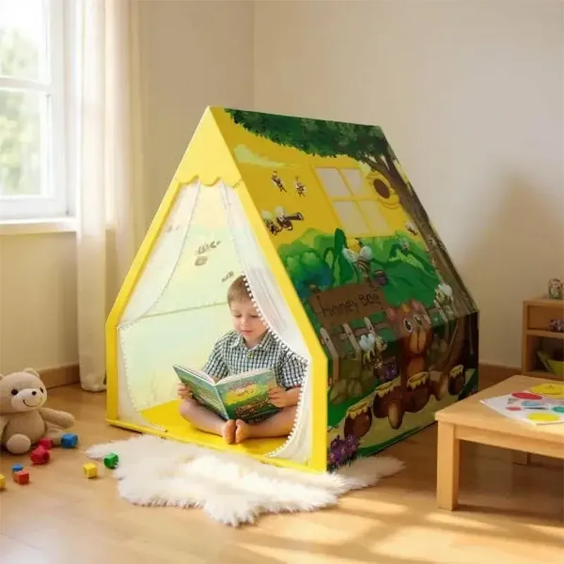 کودکان عاشق بازی در چادر بازی کودک هستند. کودکان میتوانند در چادر بازی کودک مدل خرس مهربون بازی کنند، رویا ببافند یا در آن خلوت کنند. این چادر بازی کودک با اندازه (طول 120 عمق 120 ارتفاع 150 سانتیمتر) به شکل چادر سرخپوستی طراحی شده است که فضای قابل استفاده زیادی درون آن وجود دارد. فریم اصلی از لولههای پلاستیکی بلند و اتصالات داخلی ساخته شده است. مونتاژ آن بدون هیچ ابزاری و به سادگی انجام میشود و ثبات خوبی را فراهم میکند. پوشش پارچهای با الگوهای اصلی بر روی فریم کشیده میشود و علاوه بر ورودی، دارای پنجره است.