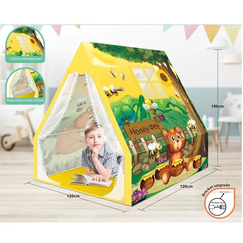 چادر بازی کودک مدل خرس مهربون یک کلبه کودک جذاب و هیجان انگیز برای نقش بازی و خاله بازی دخترهای کوچولو می باشد. این چادر بازی از جنس پارچه پلی استر است و در هر وجه آن طرحی از خرس مهربون وجود دارد و نصب بسیار راحتی نیز دارد. در یک سمت این چادر پنچره قرار دارد که کودک می تواند درون این چادر با کودکان در بیرون از چادر بازی کنند. بازی در چادر بازی به کودکان حس استقلال و امنیت میدهد چون آنجا قلمرو مخصوص آنهاست و میتوانند والدین خود را به این فضا دعوت و از بازی با آنها لذت ببرند.