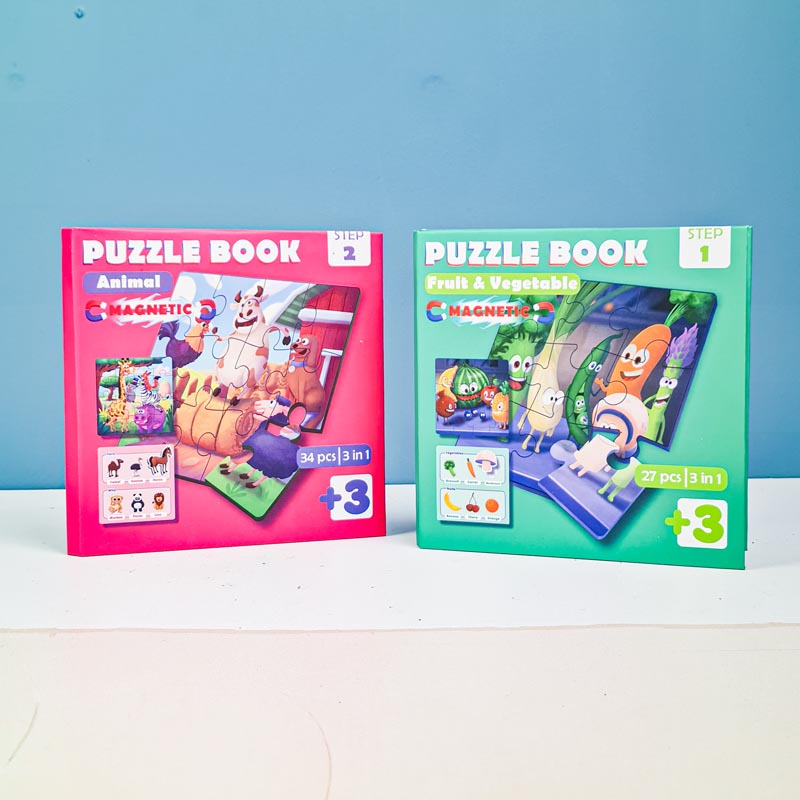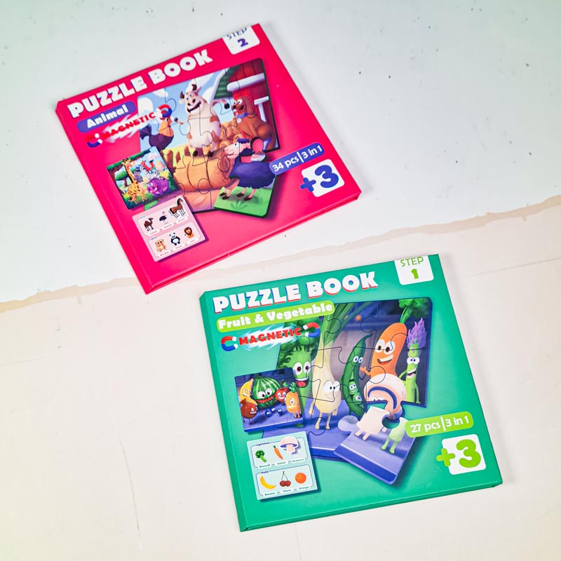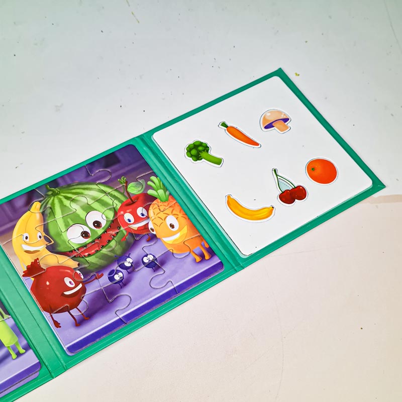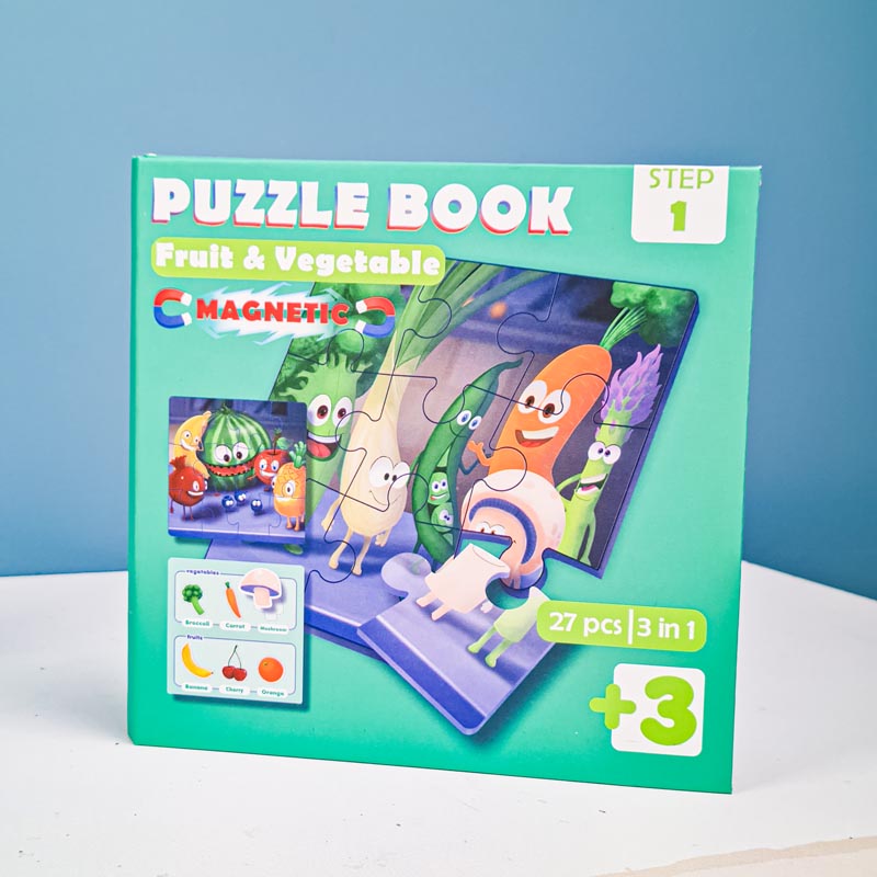 این محصول شامل 2 پازل مگنتی 9 عددی می باشد که یک بازی فوق العاده برای بچه های 3 سال و بالاتر میباشد. این پازل کودک در طرح سبزیجات: شامل پازل سبزیجات بامزه طراحی شده است. این مجموعه شامل یک سطح مغناطیسی تاشو است بنابراین تکه های پازل مگنتی به صفحه میچسبد و امکان سرخوردن و گم شدن تکه های پازل وجود ندارد به همین دلیل نگهداری و حمل آن آسان است. پازل های مگنتی 3 در 1 با مواد غیر سمی چاپ شده و همچنین لبه های گرد آن از آسیب دیدن دست کودکان جلوگیری می کند.