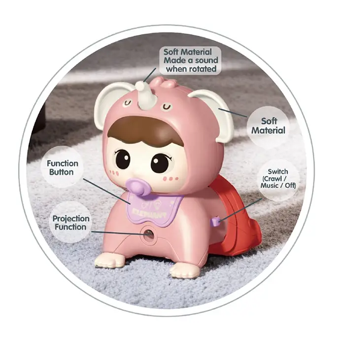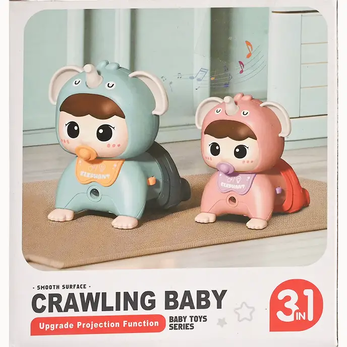 عروسک نوزاد موزیکال چهار دست و پا رونده یک اسباب بازی موزیکال است که چهار دست و پا میرود و صداهای بامزه ای مثل مامان، بابا، خنده و... از خود تولید میکند. این عروسک موزیکال چهار دست و پا رونده یک پستونک نیز در دهانش دارد که با روشن کردن عروسک شروع به چهار دست و پا رفتن میکند و موزیک بامزه ای از آن خارج میشود. با فشار و نگه داشتن دکمه روی سینه این عروسک پروژکتور آن فعال می شود و روی دیوار تصویر بامزه ای پخش میکند. این عروسک برای کودکان بالای 6 ماه و یا کودکانی که به تازگی شروع به چهار دست و پا رفتن میکنند مناسب است. تمامی اجزای این محصول از پلاستیک ABS (پلاستیک زیست محیطی) ساخته شده است که فاقد هرگونه مواد مضر و رنگ شیمیایی است و برای سلامت کودکان خطری ایجاد نمیکند. عروسک نوزاد موزیکال چهار دست و پا رونده یک اسباب بازی دخترانه و اسباب بازی پسرانه مناسب است.