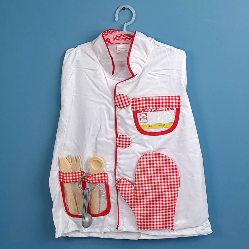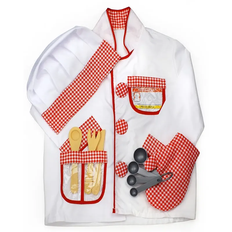 لباس مشاغل کودک مدل سرآشپز با لوازم یک ست شامل روپوش و لوازمی مانند کلاه، دستک، قاشق و چنگال، پیمانه است. این لباس مشاغل برای مهدکودک ها، خانه های مشاغل کودک و خانه بازی ها نیز فوق العاده است. موجب افزایش خلاقیت کودکان و آشنایی آنها با مشاغل مختلف میشود.