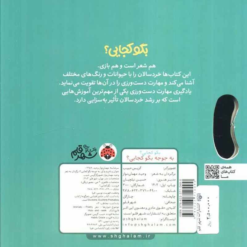 بگو کجایی؟ هم شعر است و هم بازی. این کتاب ها خردسالان را با حیوانات و رنگ های مختلف آشنا می کند و مهارت دست ورزی را در آن ها تقویت می نماید. یادگیری مهارت دست ورزی یکی از مهم ترین آموزش هایی است که بر رشد خردسالان تاثیر به سزایی دارد.