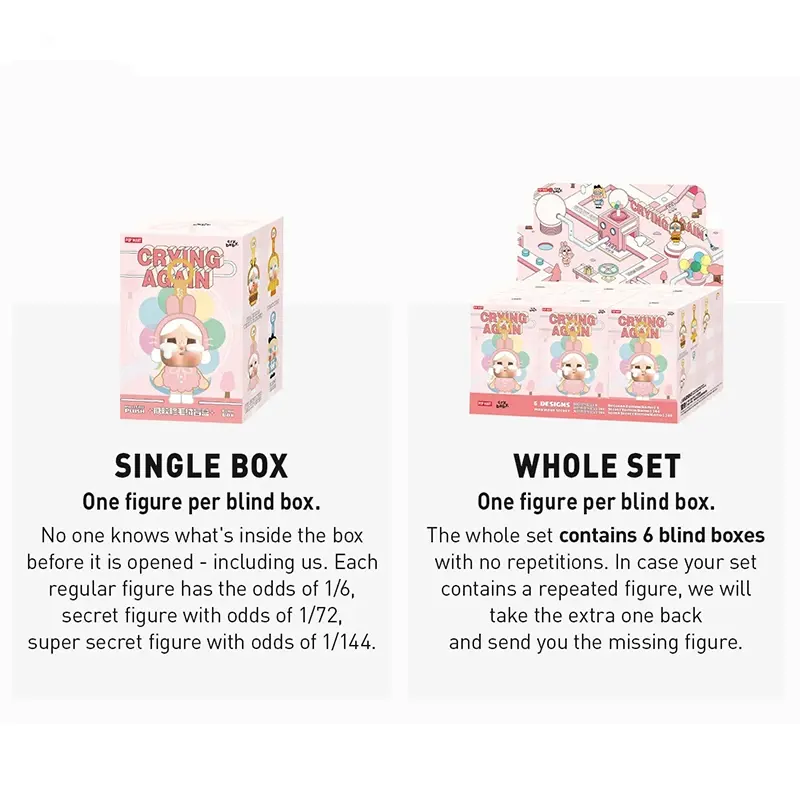 بلایند باکس یا عروسک شانسی کرای بیبی crying again از برند محبوب پاپ مارت (POPMART) یکی از جدیدترین ترندهای محبوب بین کودکان، نوجوانان و حتی بزرگسالان در دنیاست! این شخصیت بامزه با لباس خز بامزه و اشک هایی که دور چشمانش حلقه زده است یک اسباب بازی محبوب برای کودکان و نوجوانان است. عروسک شانسی عروسک کرای بیبی با چهرهای معصوم، چشمانی اشکآلود هر بیننده ای را به خود خیره میکند. طراحی عروسک شانسی کرای بیبی پاپ مارت مدل crying again توسط ژوئن، هنرمند معروف چینی، انجام میشود. او با ترکیب عناصر فانتزی و احساسات انسانی، توانسته شخصیتی ماندگار و جذاب خلق کند.