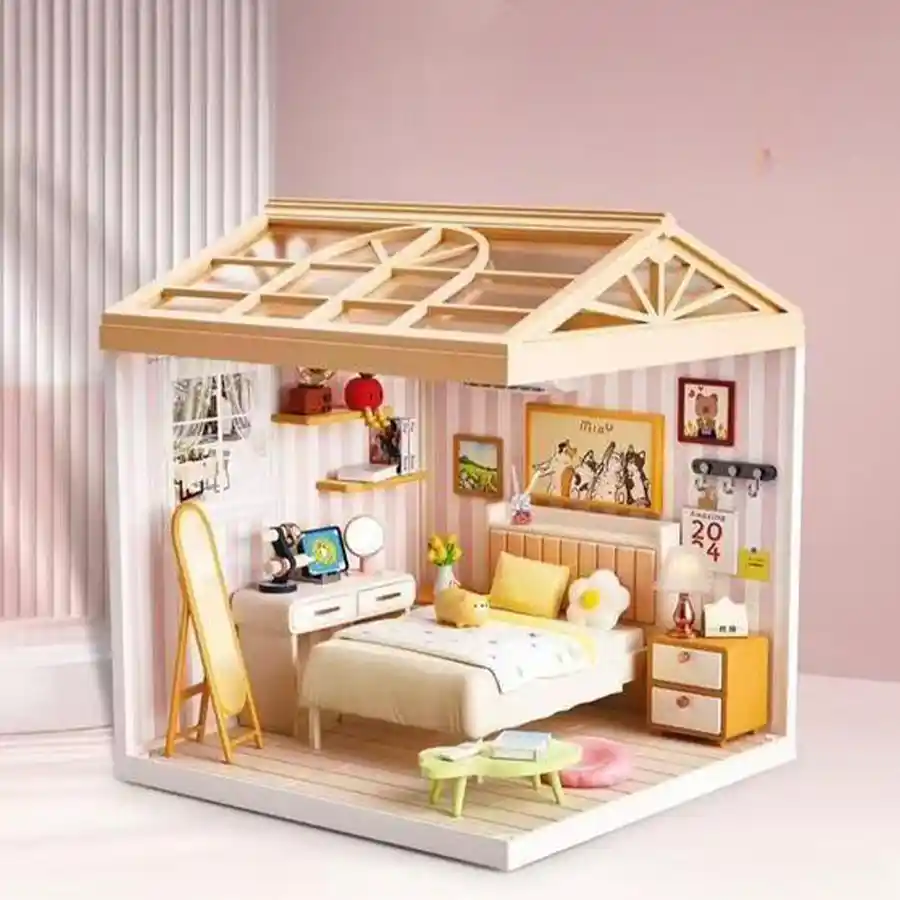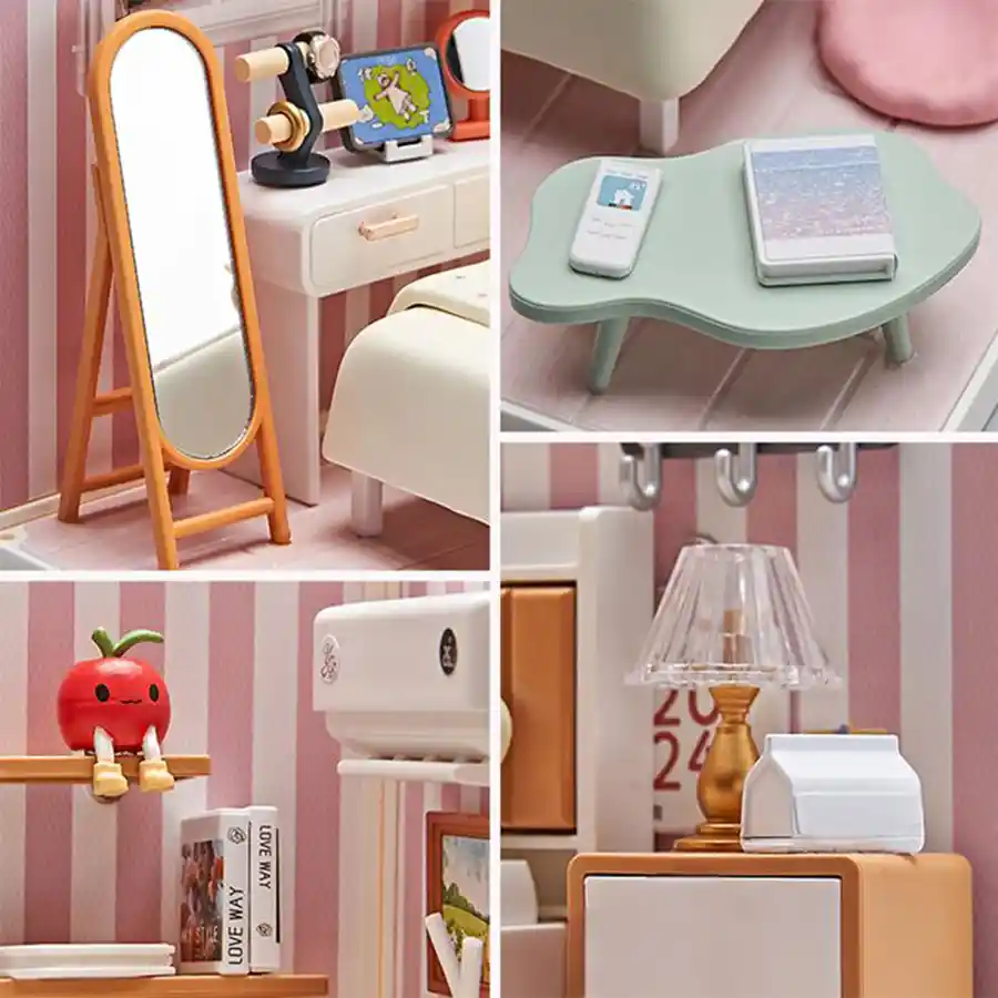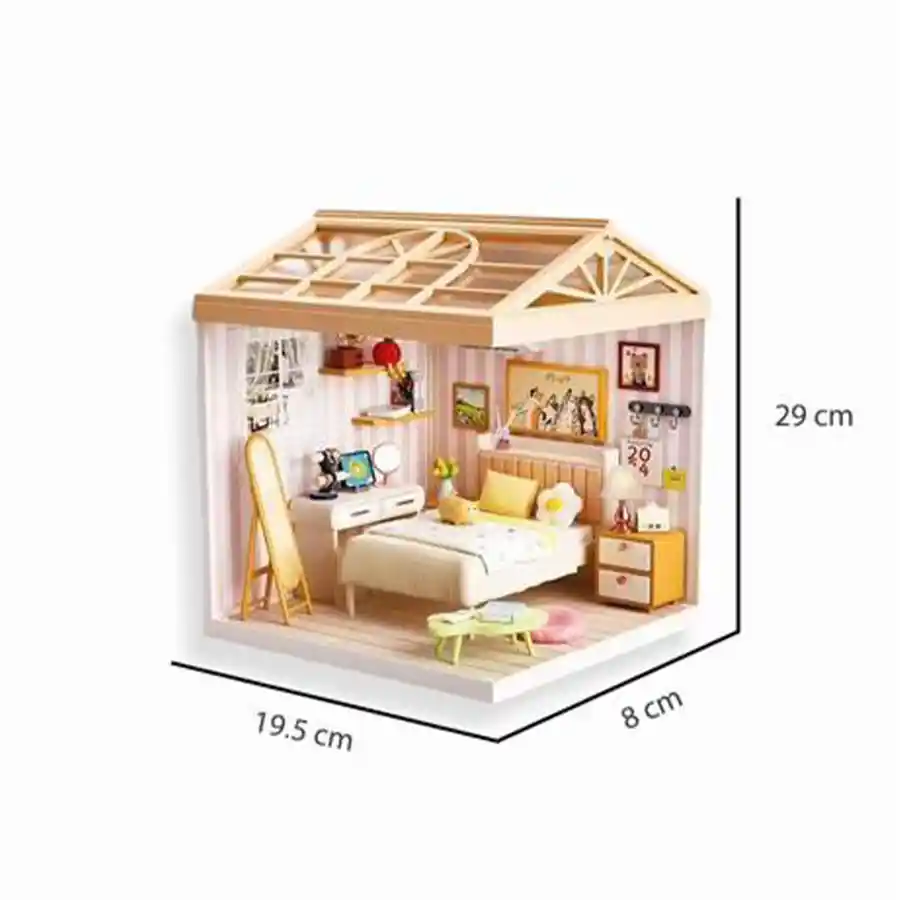 این اسباب بازی جدید از جنس پلاستیک با کیفیت ساخته شده است و قطعات آن به راحتی در هم چفت میشود این سازه دارای اکسسوری های ریز برای چیدمان اتاق خواب می باشد. این خانه مینیاتوری دارای 82 قطعه برای ساخت است به همین دلیل و به دلیل داشتن قطعات ریز برای بچه های بالا 8 سال مناسب می باشد. همچنین این اسباب بازی دارای جای باطری و لوازمی برای روشن کردن چراغ های ال ای دی می باشد. این مجموعه یک راه بسیار خوب برای تشویق کودکان به خلاقیت است و به بچه این امکان را می دهد تا خود را در نقش یک معمار و طراح ببینند.